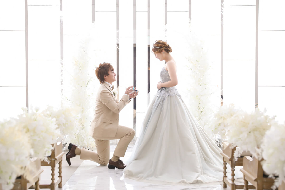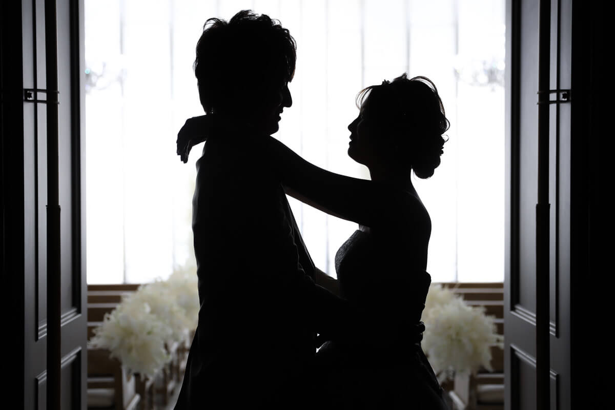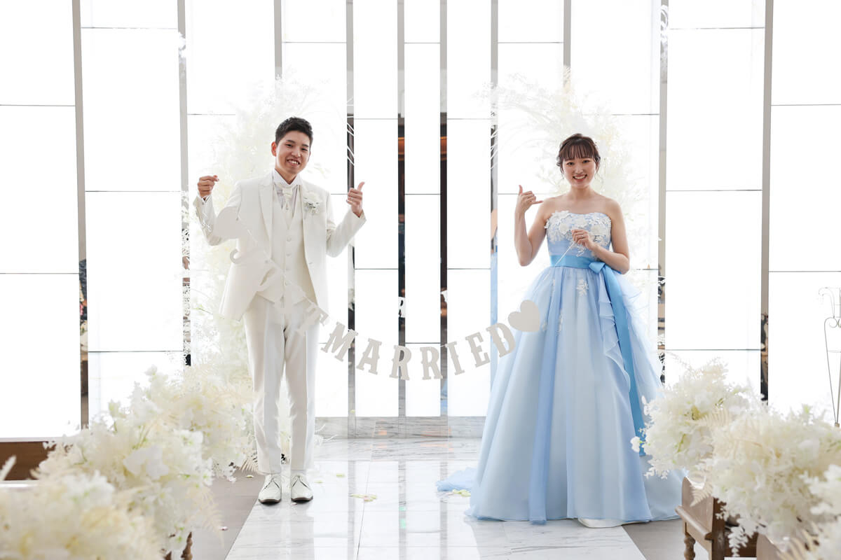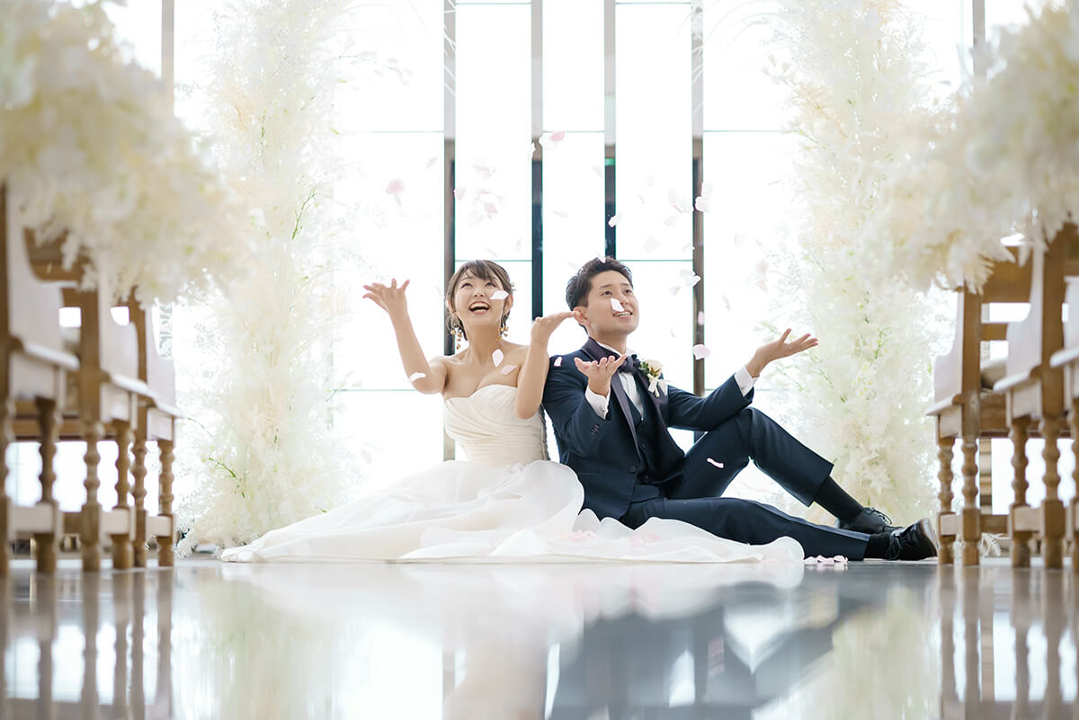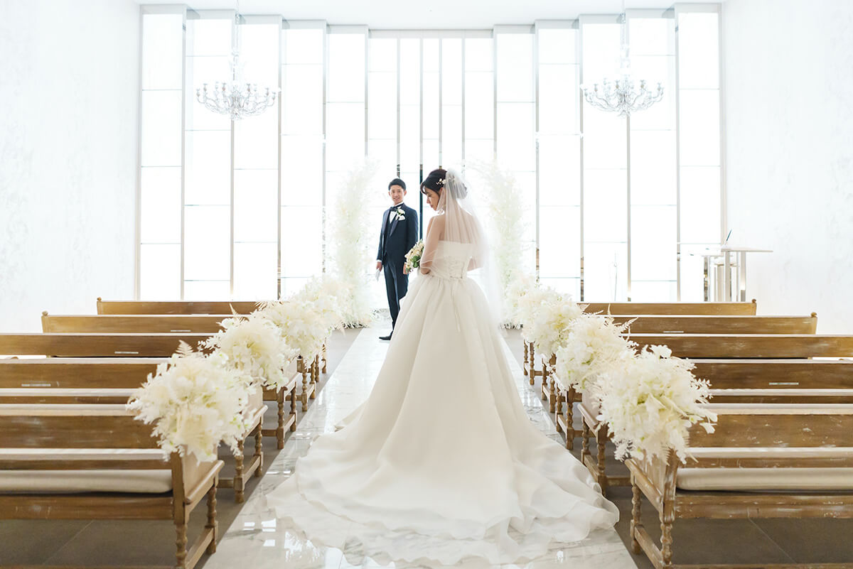 正面からの明るい光に、大理石のバージンロードに映り込むおふたりの姿が幻想的。