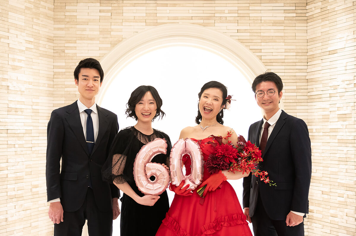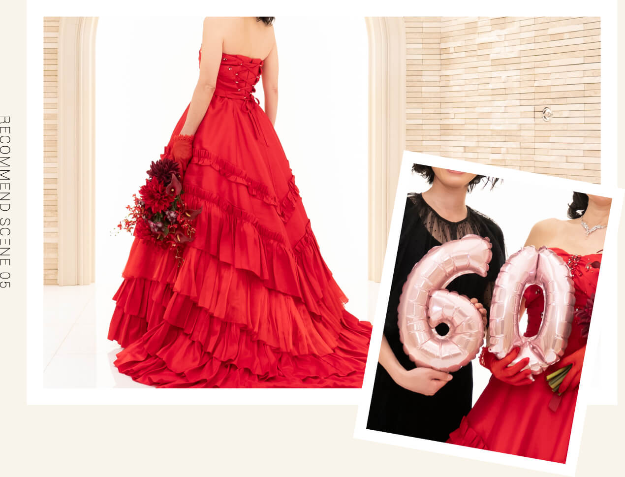 還暦の記念に赤のドレスを着て、人生の節目を華やかに彩りましょう!お子様からご両親へのプレゼントとしてもご利用いただいています。