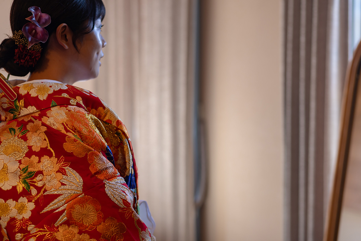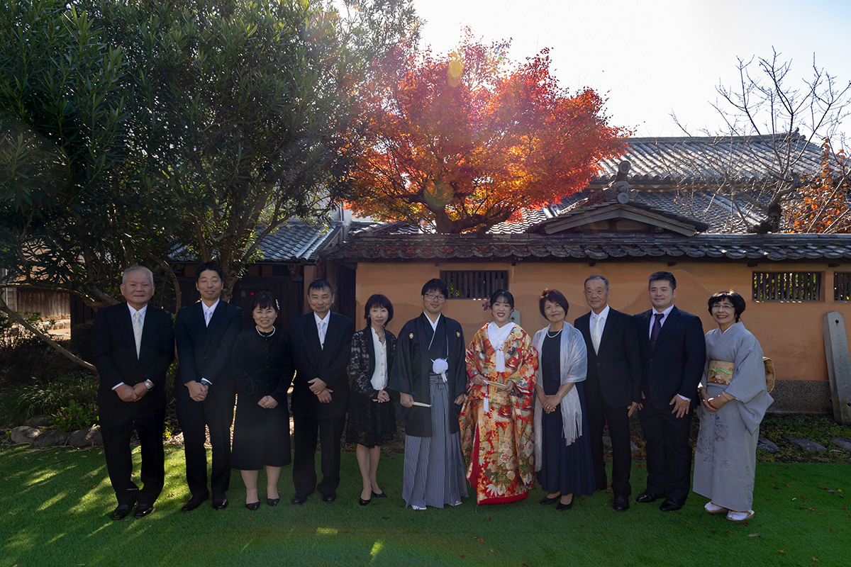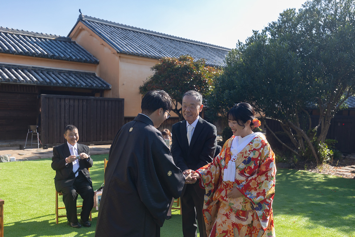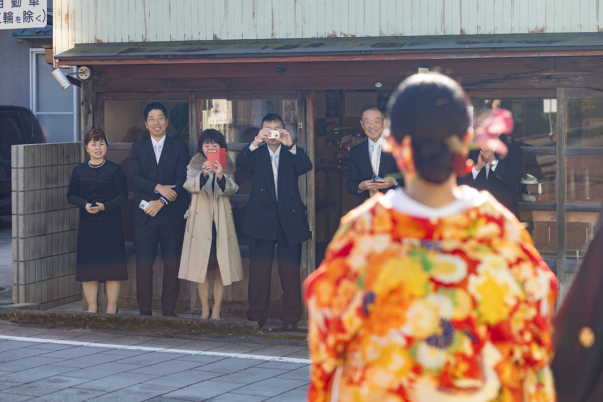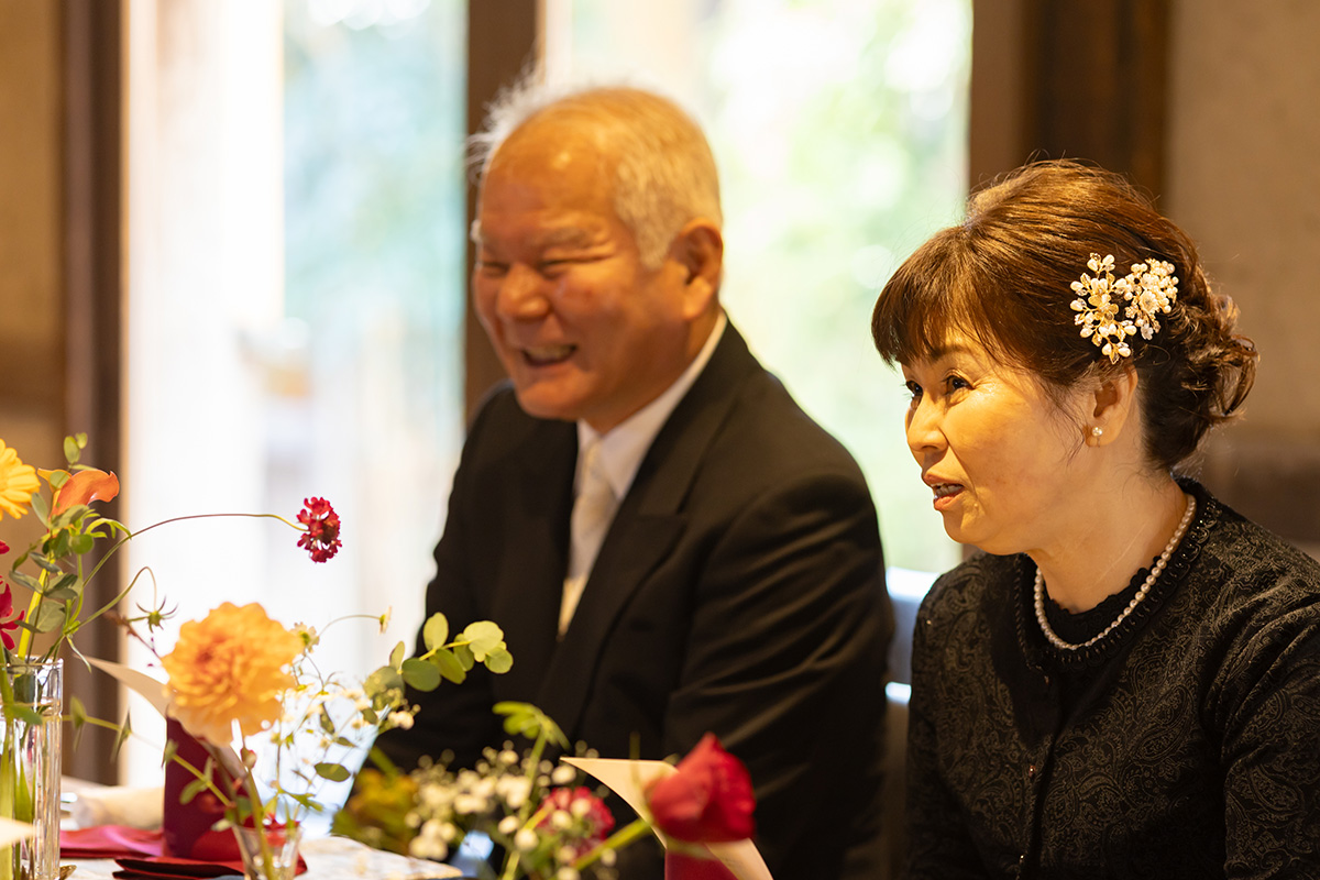 装花の彩りと笑顔が重なり