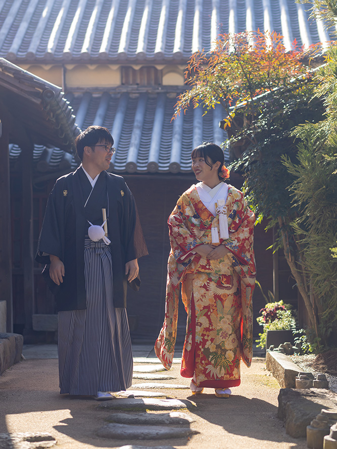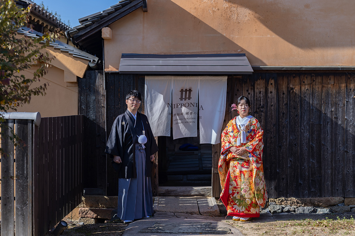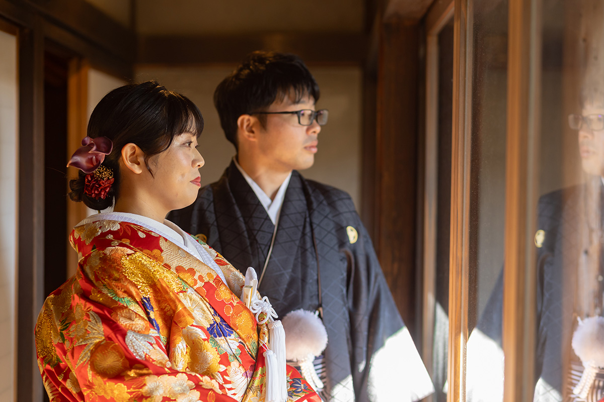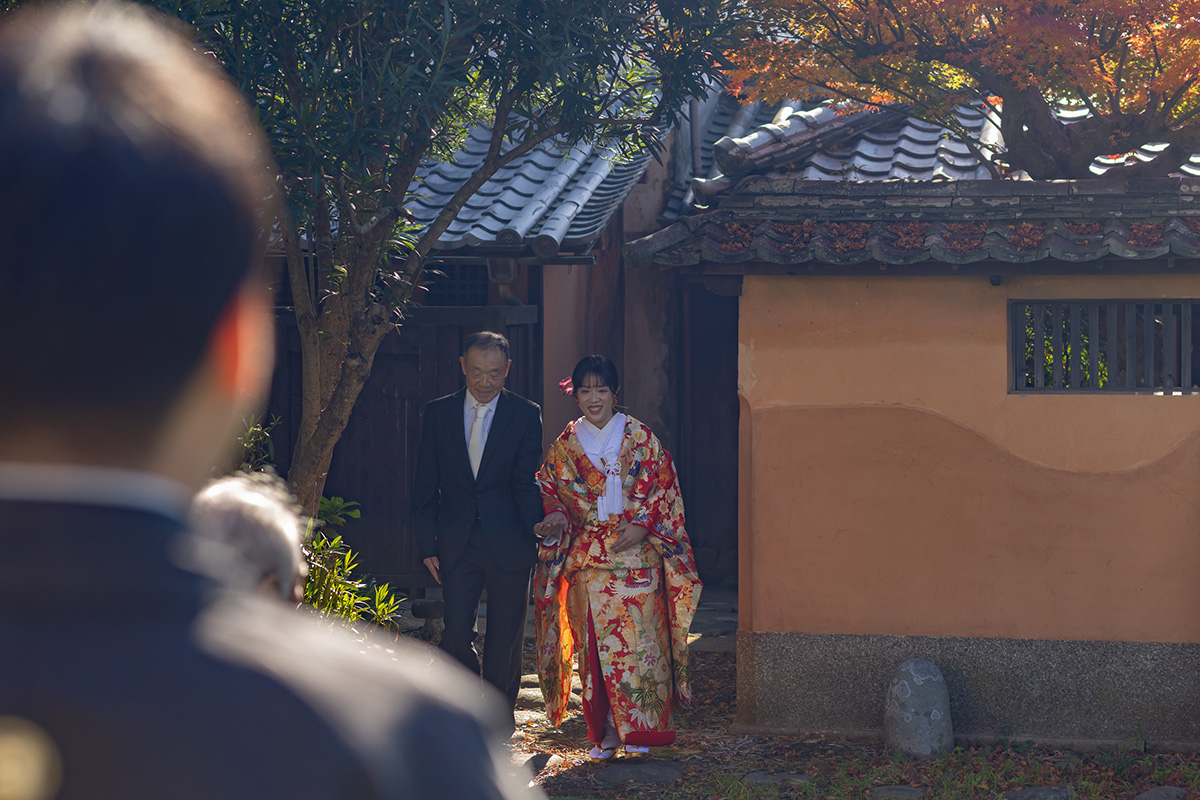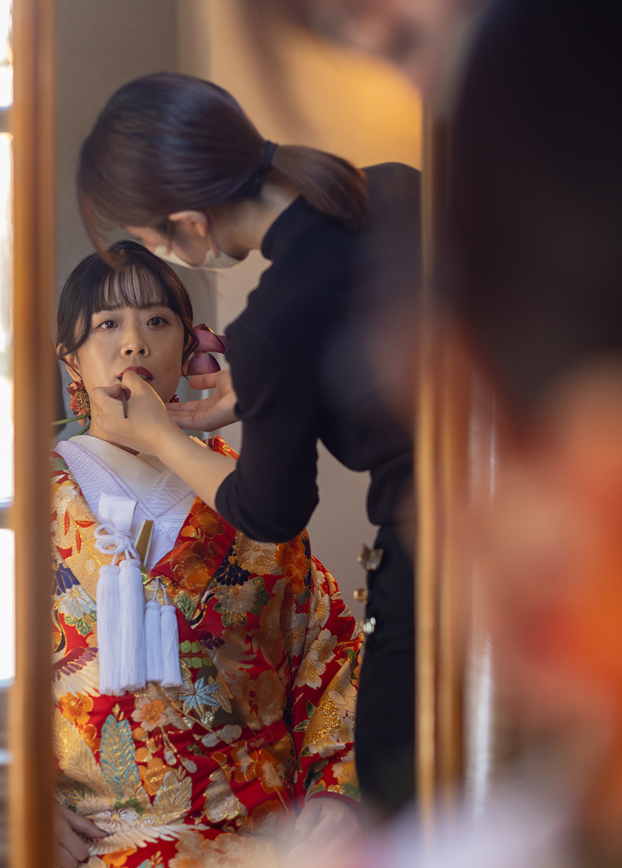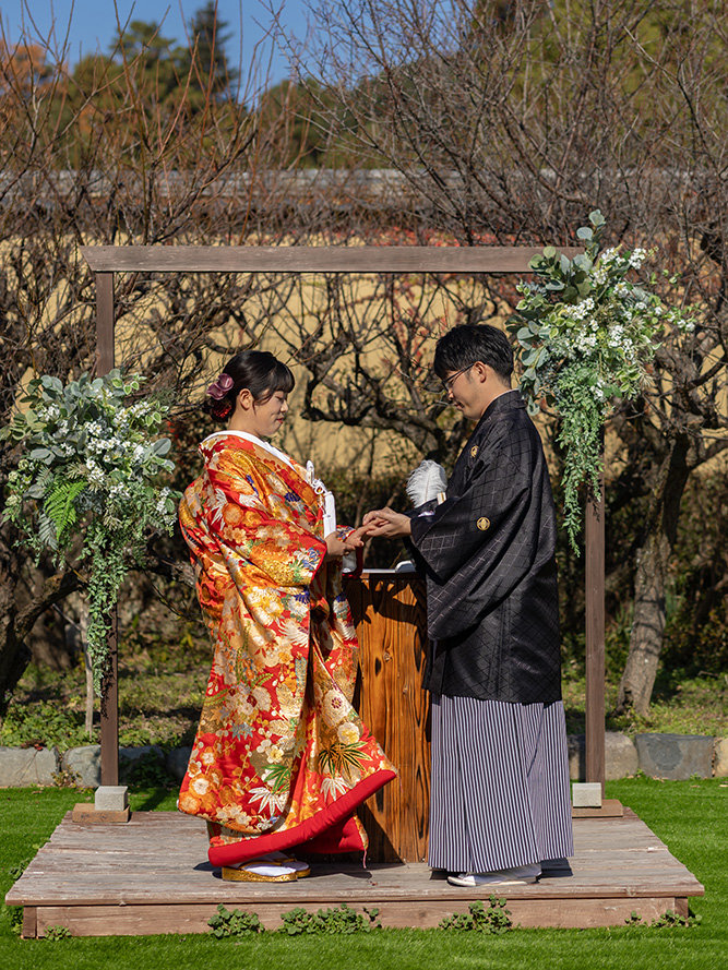 装花の彩りと笑顔が重なり