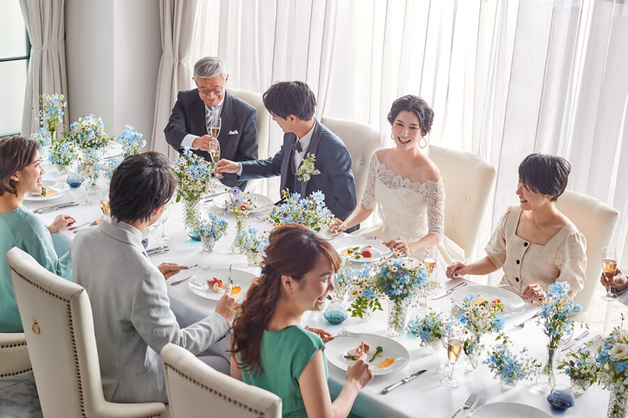 小さな結婚式で挙式される方の90%は、挙式後にご家族・ご友人やペットとお食事会(会食)をされています。小さな結婚式に併設された会場や、近隣の提携レストラン・料亭のご紹介、セッティングも承っています。