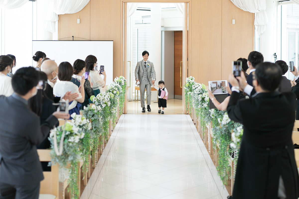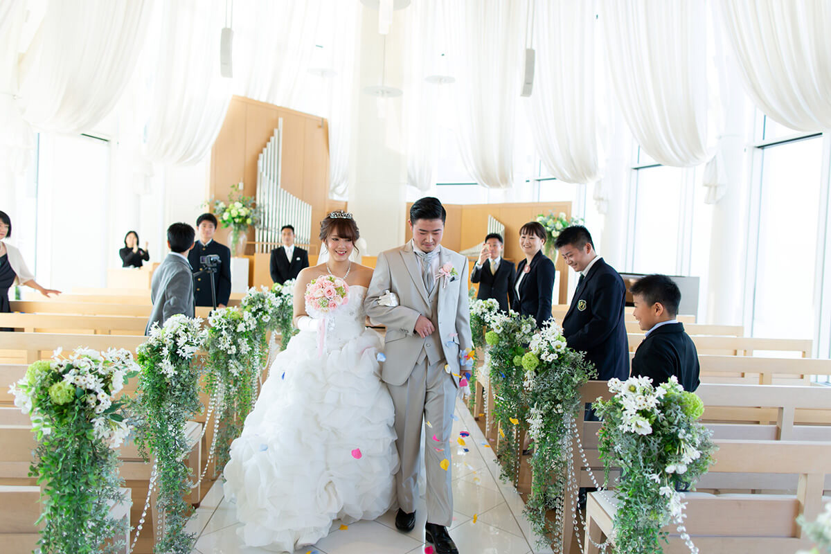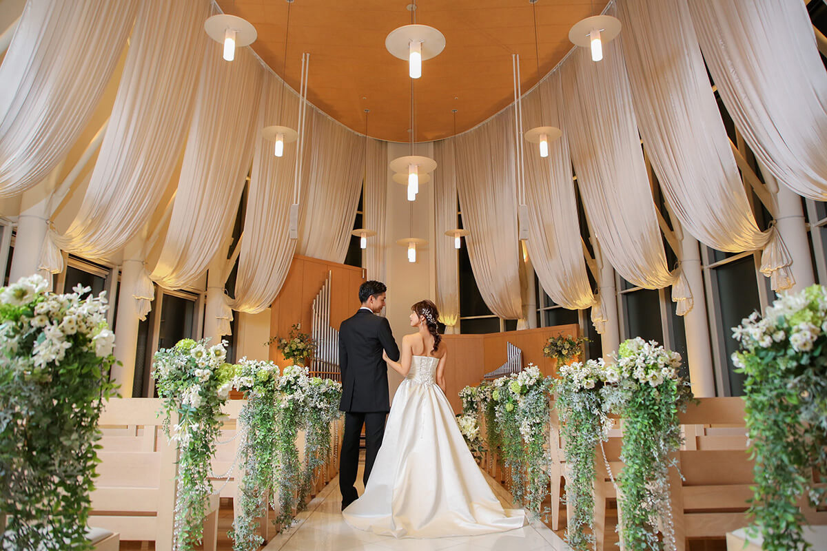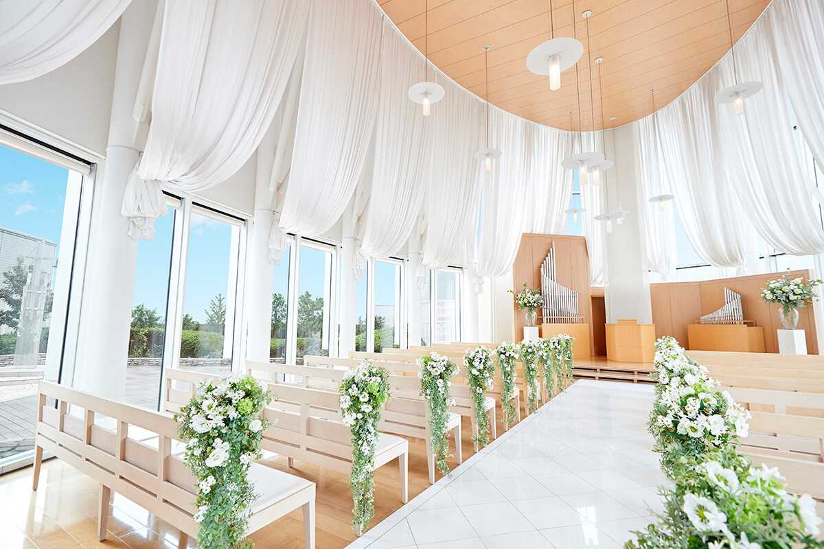 360度ガラスに囲まれた式場に、窓からはたっぷりと差し込む自然光やグリーンの樹々が、