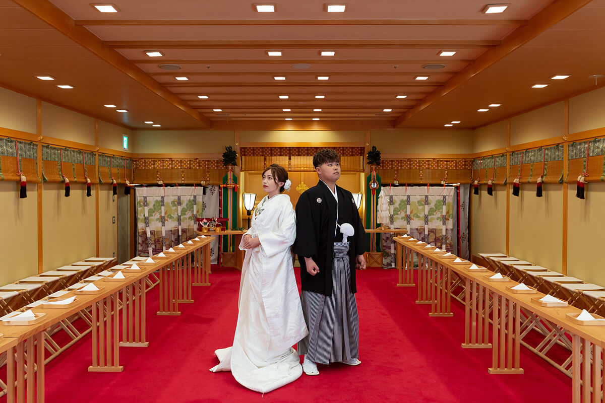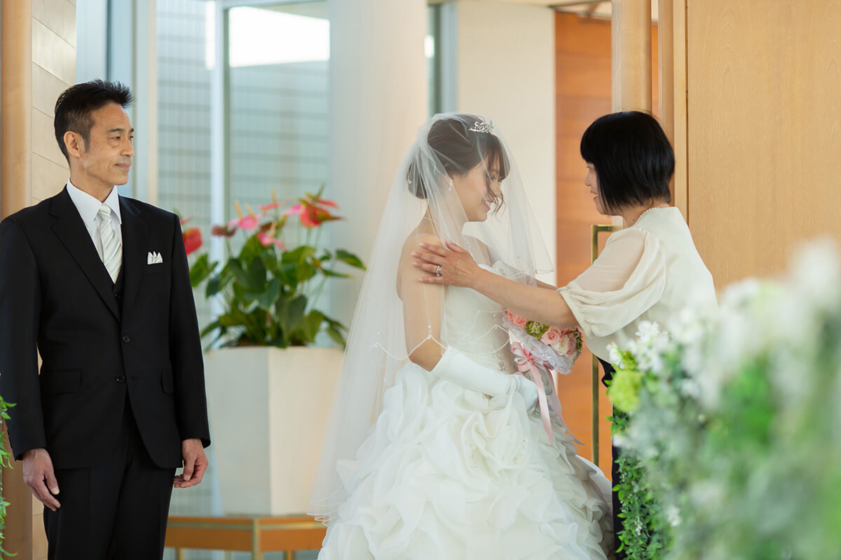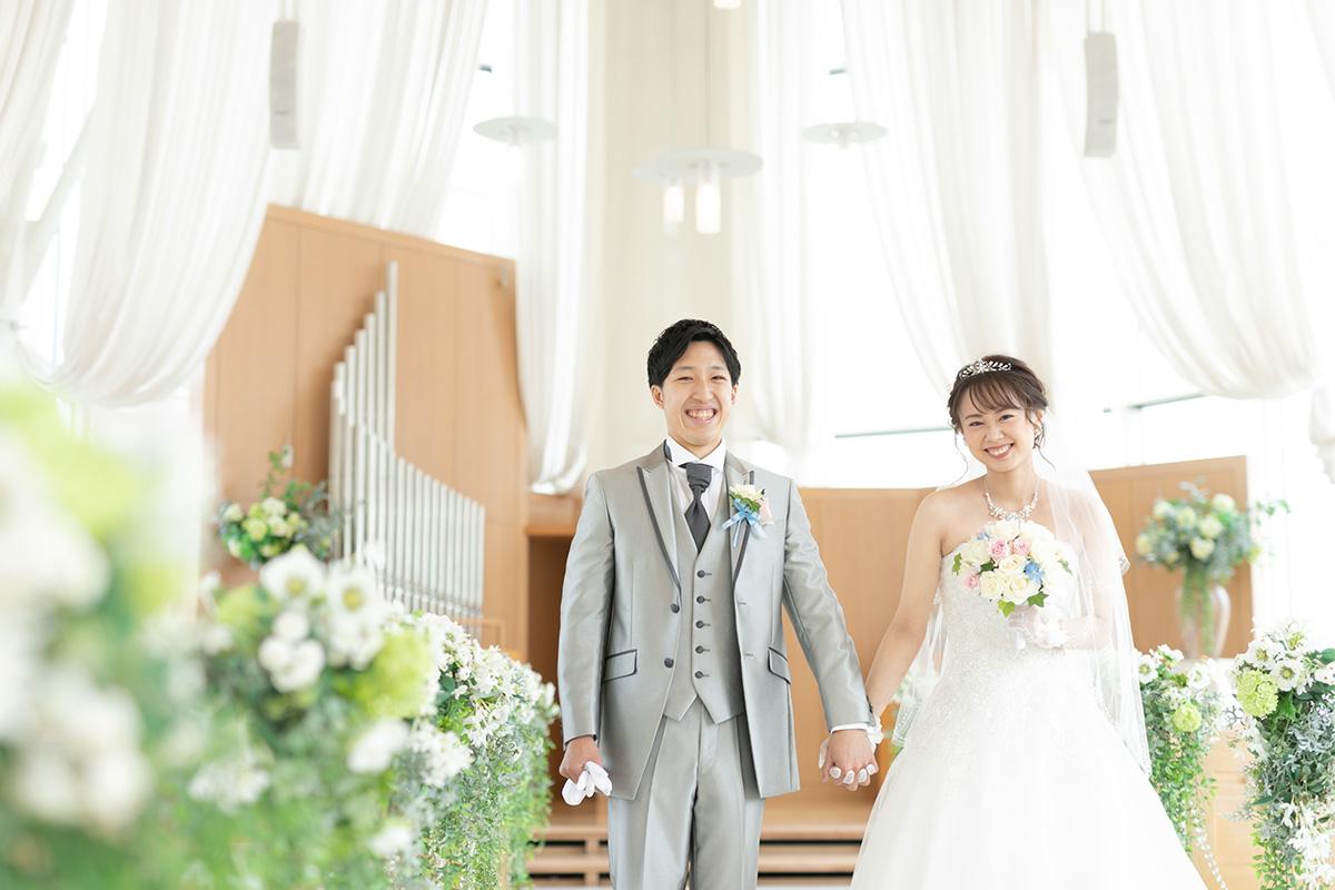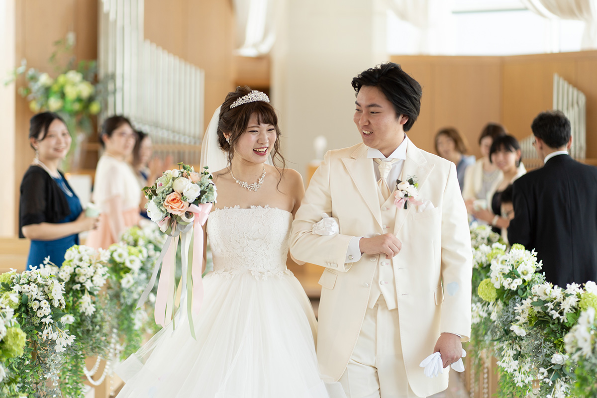 360度ガラスに囲まれた式場に、窓からはたっぷりと差し込む自然光やグリーンの樹々が、