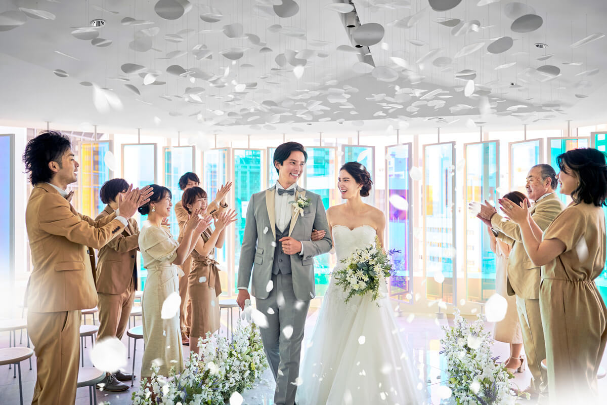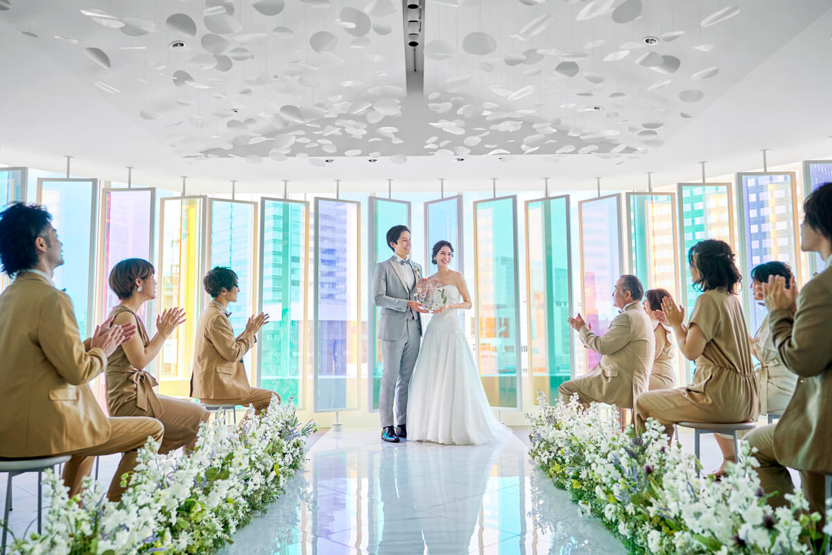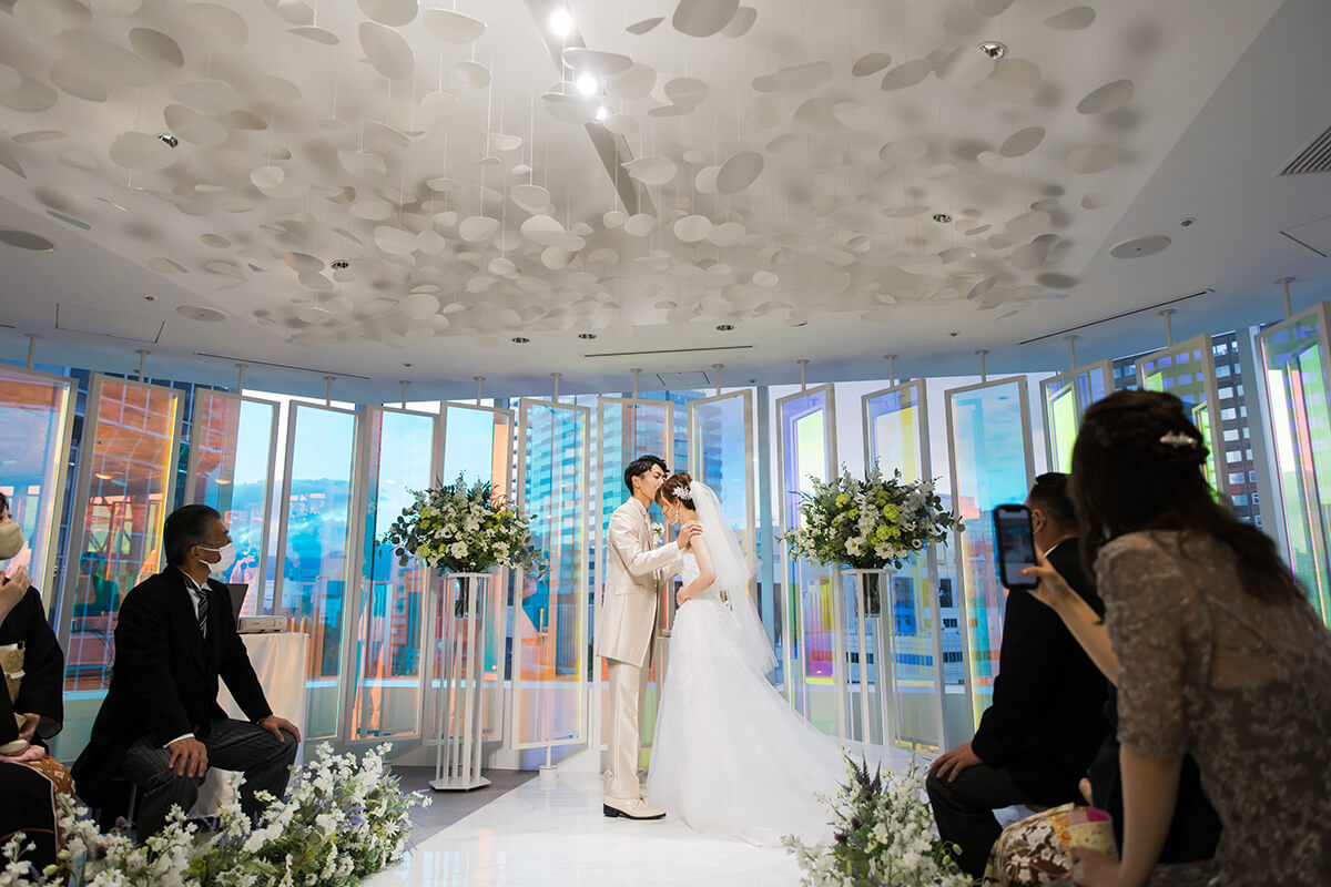 “プリズム”をコンセプトに空間全体を色と光が交わる幻想的なチャペル。