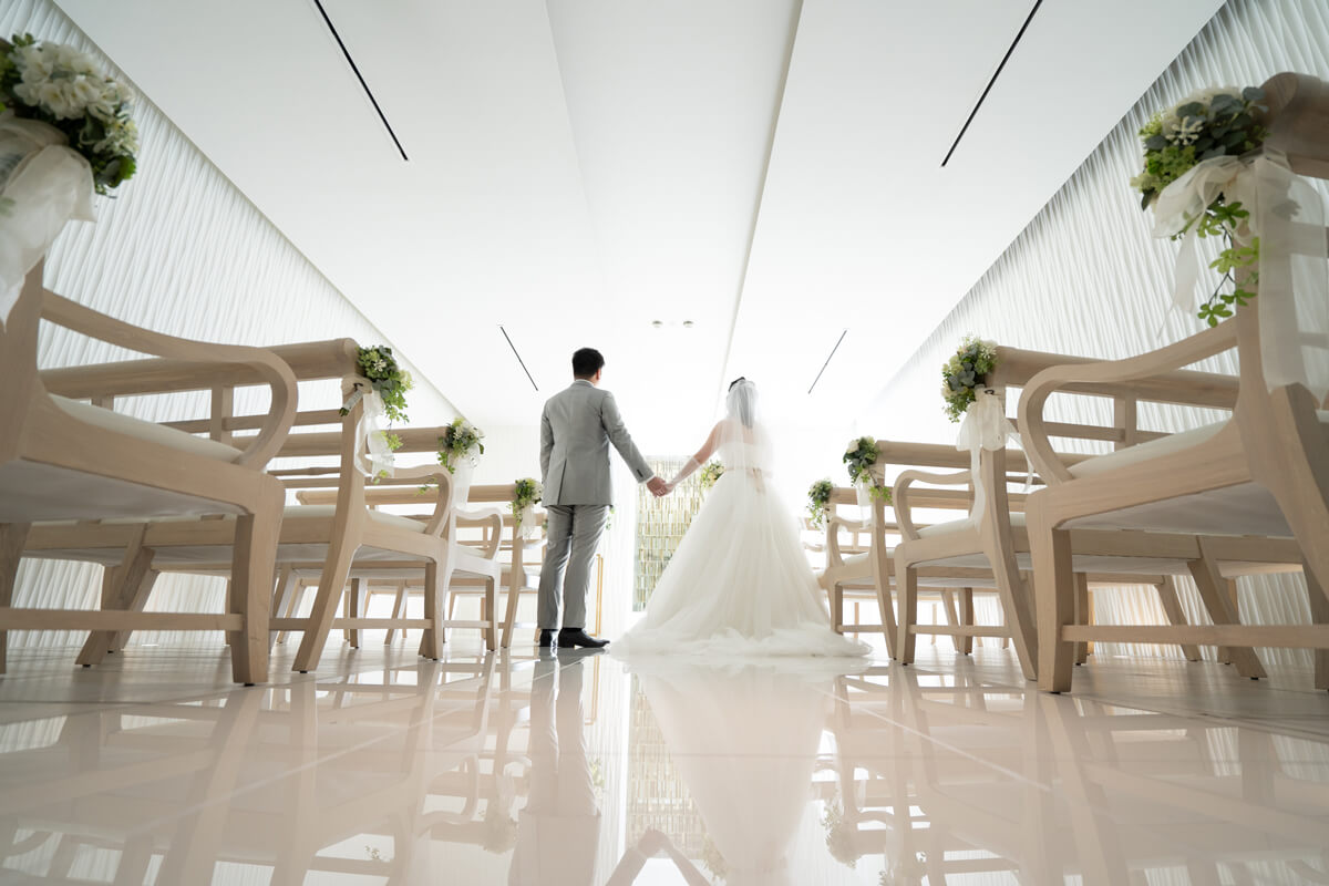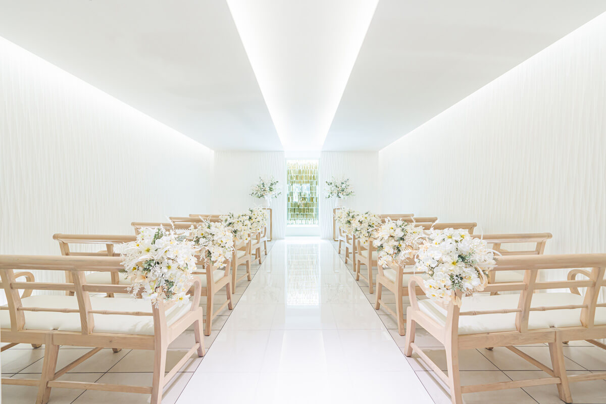 静謐に包まれた純白のチャペル。なかでも、チャペル正面のガラス窓は印象的で、