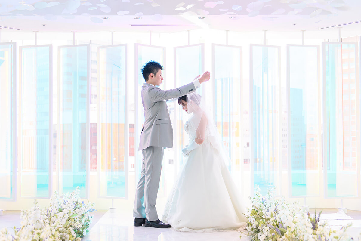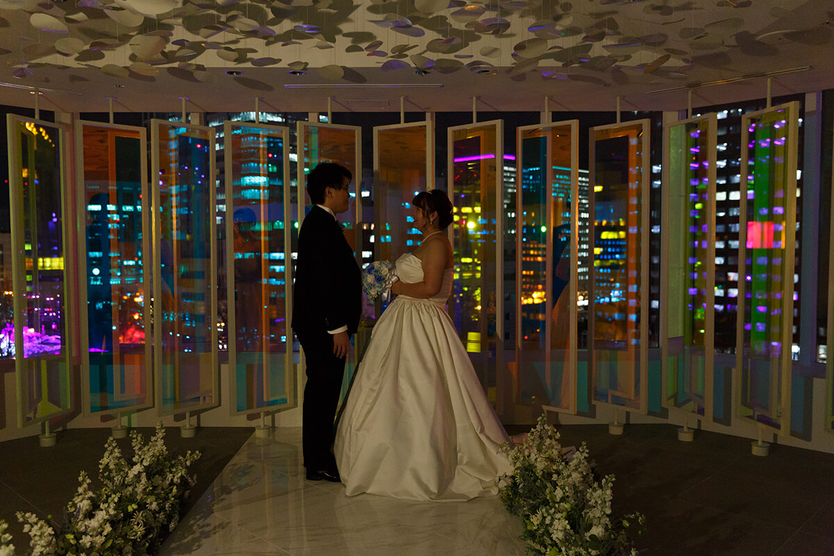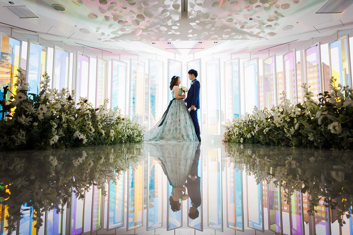 “プリズム”をコンセプトに空間全体を色と光が交わる幻想的なチャペル。