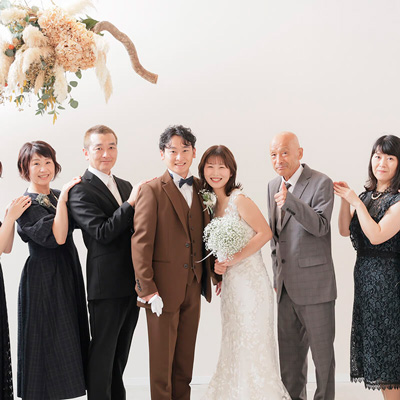 フォトウェディング撮影のあと、ご家族・ご友人やペットとのお食事会(会食)も◯。撮影で着用したウェディングドレス・和装のまま会食会場への移動もOK。もちろんお色直しや会食中の撮影も可能です。※一部店舗を除く 詳しくはこちら +