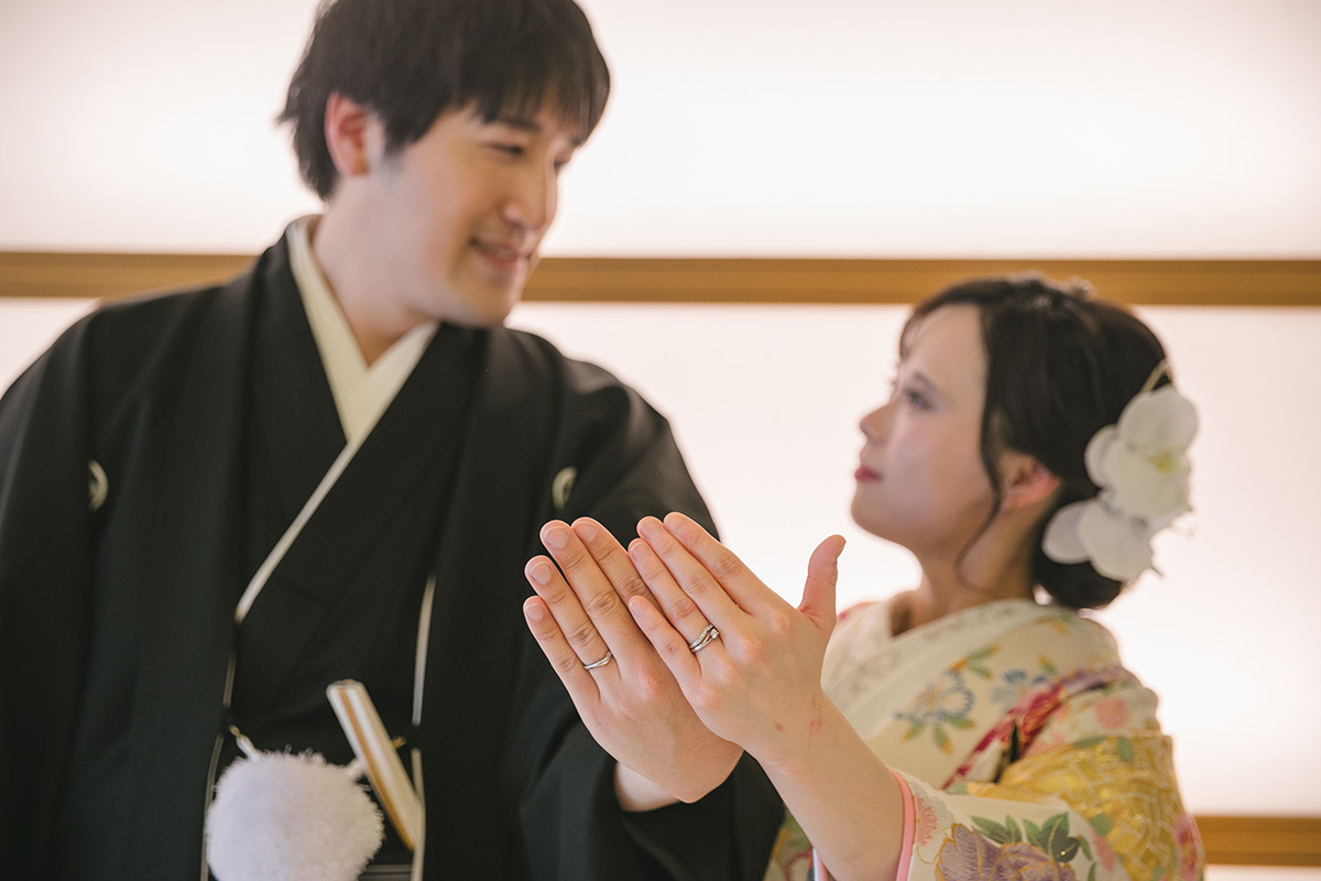 三々九度の儀から指輪交換へ。伝統と想いが重なる、静謐なひととき。