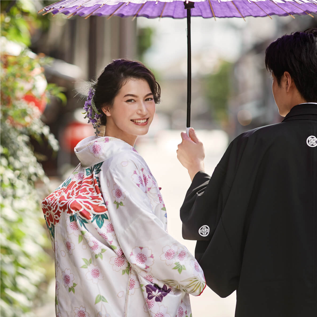 最高の晴れ姿にする婚礼和装古くから受け継がれてきた伝統の和装衣装は、どれも魅力的な物ばかり。 両親や祖父母にも馴染み深い白無垢(しろむく) は、清純でおしとやかな雰囲気に。また、色打掛や引振袖は、色柄が豊富に選べるのがポイント。可愛らしく華やかなデザインから、大人っぽい品の良さまで様々な演出ができます。