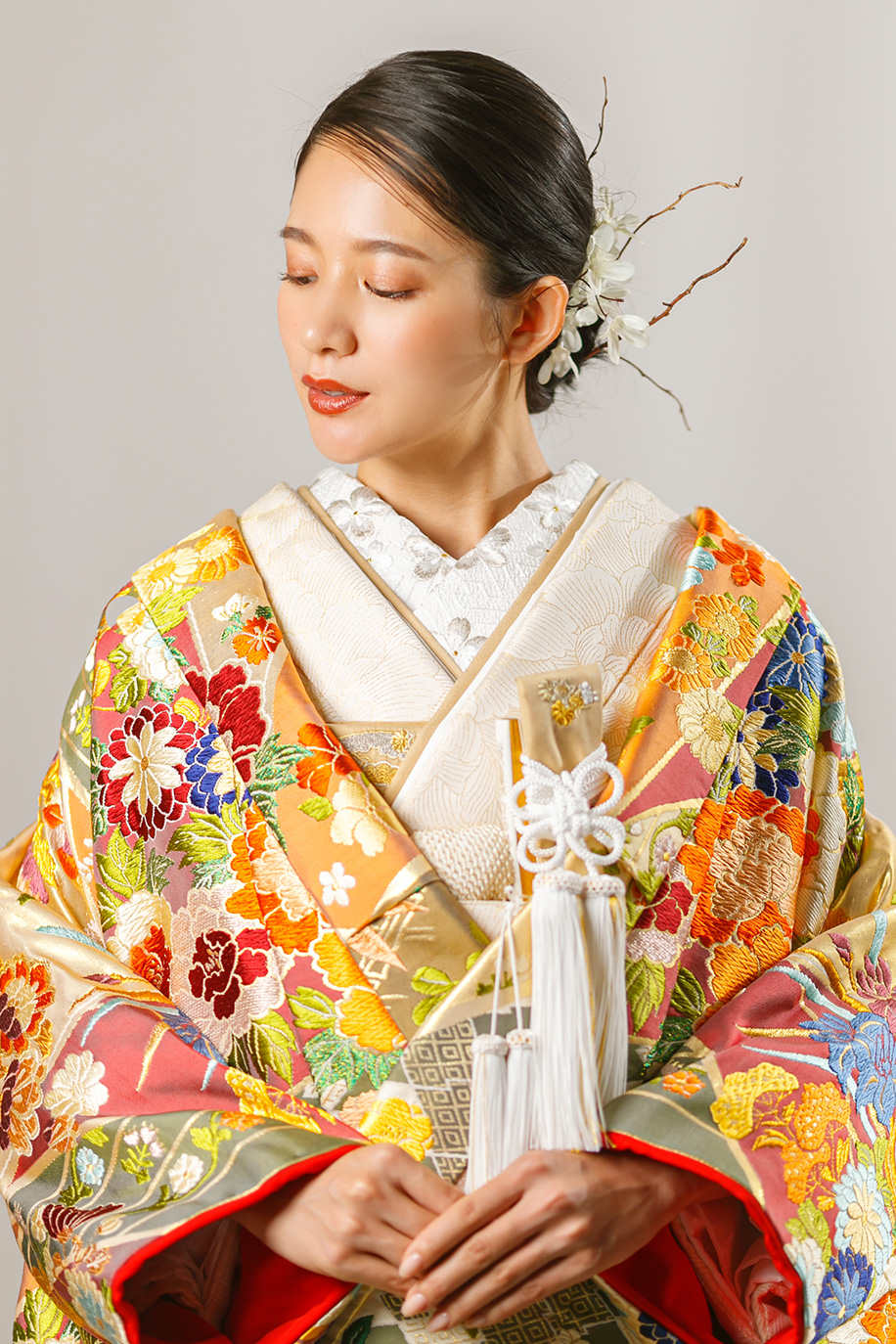 小さな結婚式では、こだわりの和装を沢山取り揃えております。和装婚礼衣装のなかで最も格式の高い白無垢はもちろん、松竹梅のお花や鶴など柄がたっぷり刺繍されていて、贅沢で華やかな色打掛。また、沖縄の伝統衣装である琉装もご用意しております。