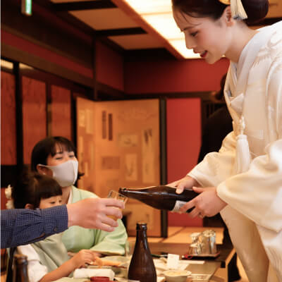 和装で結婚式をした後は、小さな結婚式が提携する会食会場にてご会食を行っていただけます。和装にぴったりの会場をご紹介させていただきますので、和テイストを取り入れた演出をお楽しみください。特別な日に、ご家族や親しい友人や知人と絆を深めるご会食はいかがでしょうか?