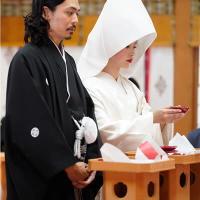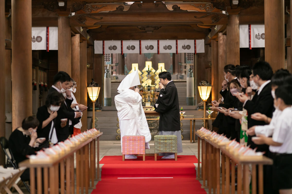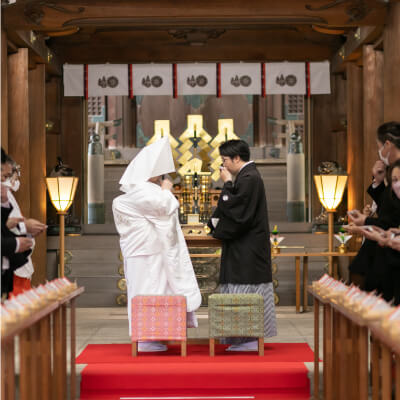 行われる美しい和の挙式緊張感のある厳かな雰囲気が魅力の神社挙式。