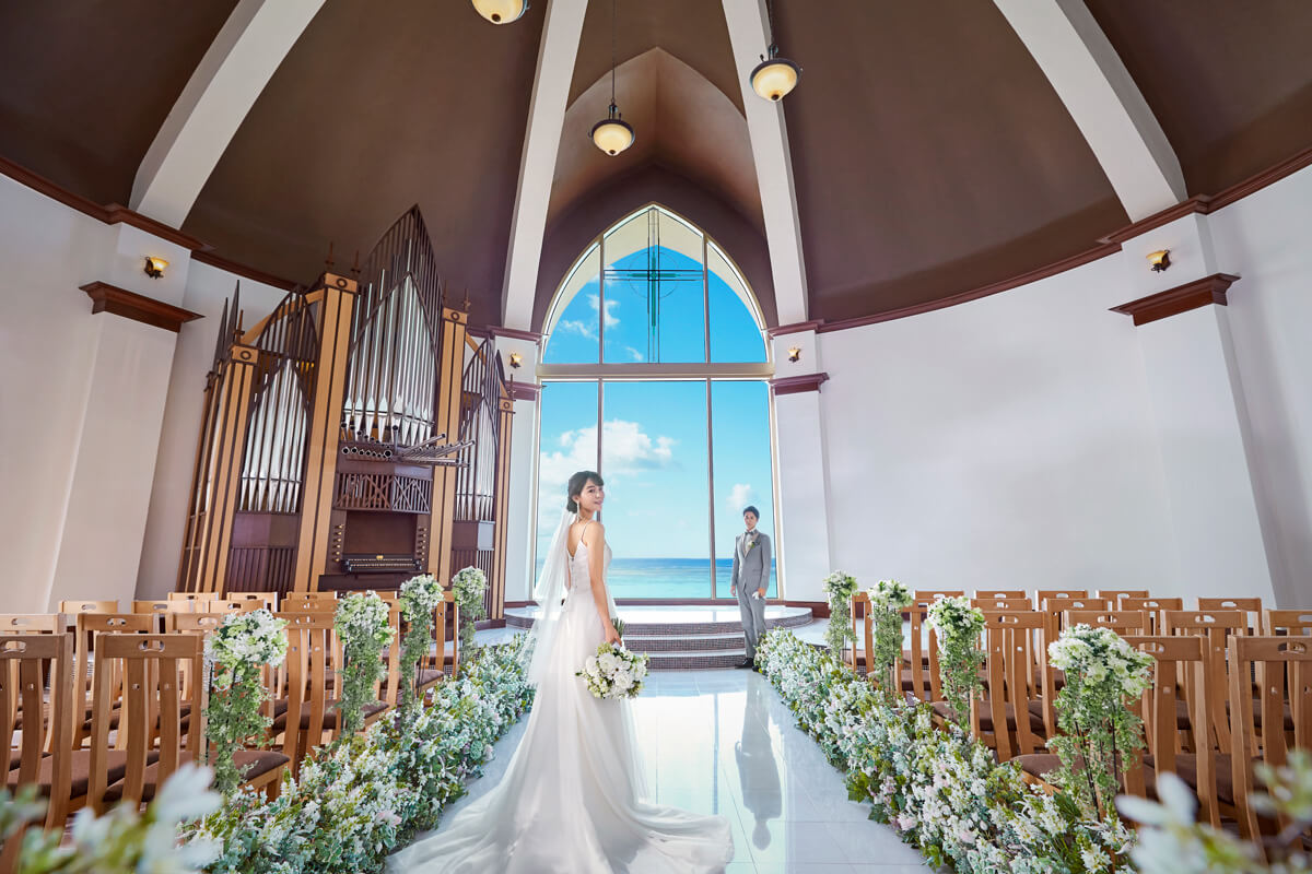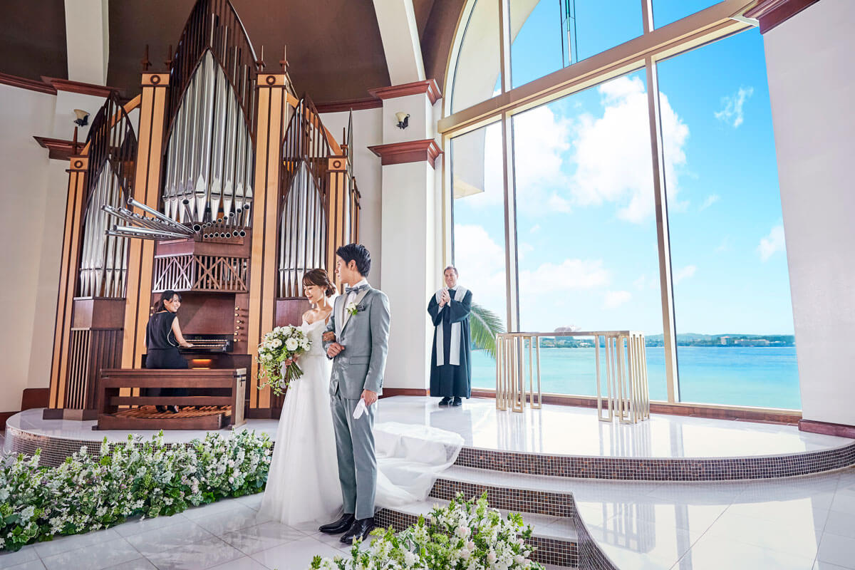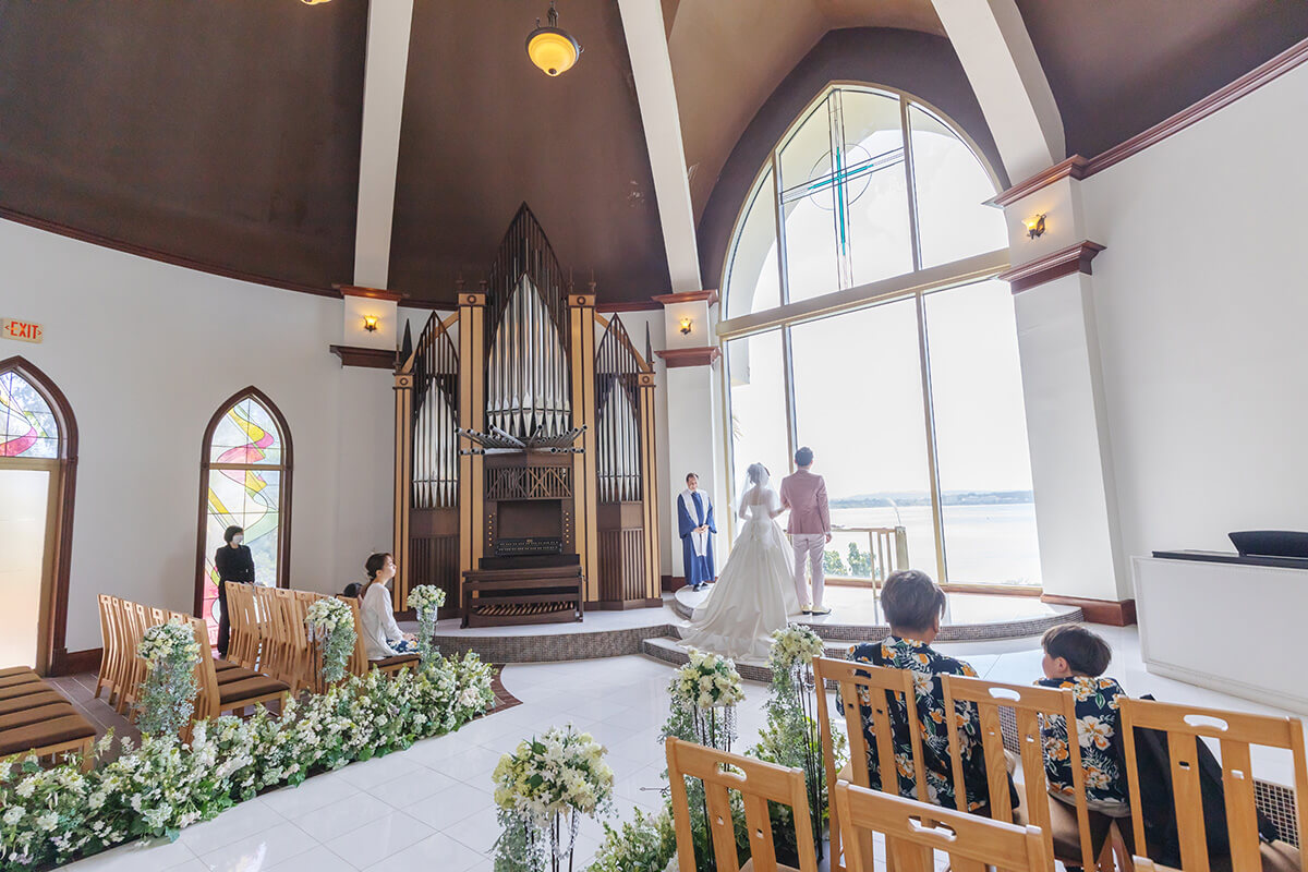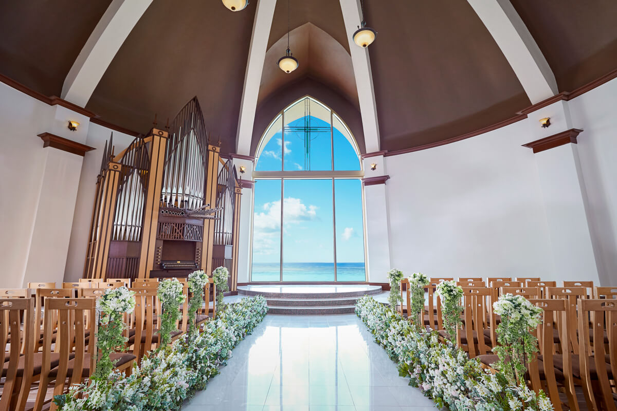 内観には優しい温もりを醸し出すモクが使用され、天井は古典的なドーム型に設計されており、美しいパイプオルガンの音色がチャペル全体を包み込みます。オーシャンフロントのロケーションに響き渡る壮大なパイプオルガンの音色と、ゲストの優しい祝福に包まれるセレモニーは、おふたりにとって忘れられない1日となることでしょう。