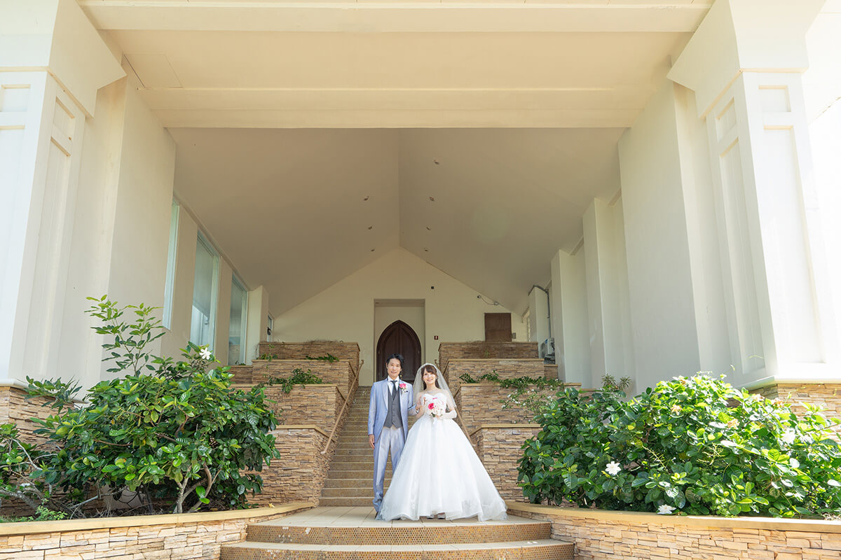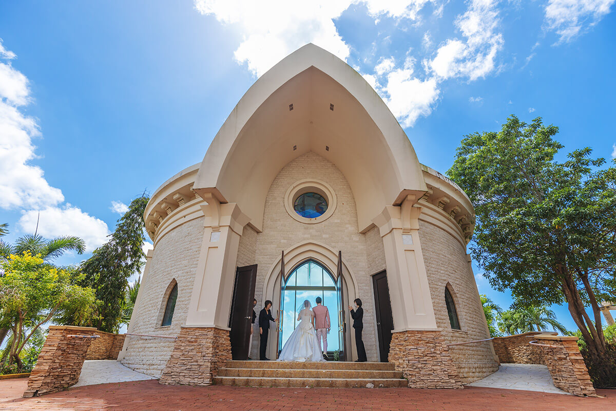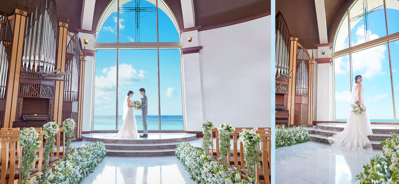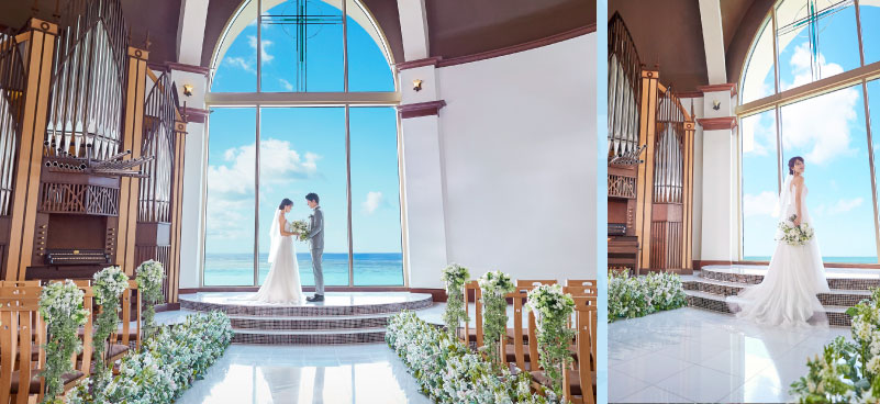 内観には優しい温もりを醸し出すモクが使用され、天井は古典的なドーム型に設計されており、美しいパイプオルガンの音色がチャペル全体を包み込みます。オーシャンフロントのロケーションに響き渡る壮大なパイプオルガンの音色と、ゲストの優しい祝福に包まれるセレモニーは、おふたりにとって忘れられない1日となることでしょう。