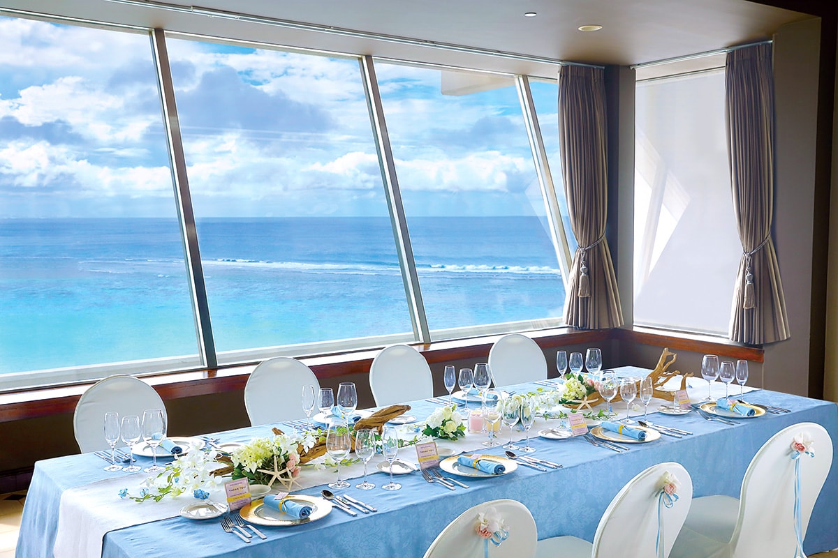 おふたりの晴れの日を彩るのは地元グアムの食材を中心に心を込めてご用意するブライダルメニュー。美味しい料理とともに楽しいひとときをお過ごしいただけます。会食会場シャルロッテでは、美しいターコイズブルーのオーシャンビューを臨むことができ、楽園の心地よい風を感じながら、美味しい料理を囲んで、ゲストの皆さまと心温まる素敵なパーティをお楽しみください。