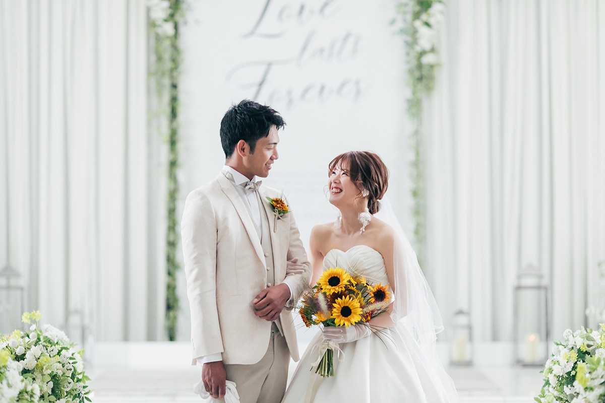 松山チャペルで行われた家族の結婚式。ひまわりのブーケが彩る温かな雰囲気のコーディネート。新郎新婦と家族の涙と笑顔が交錯する感動的なセレモニーとなり、特別なひとときを共有しました。