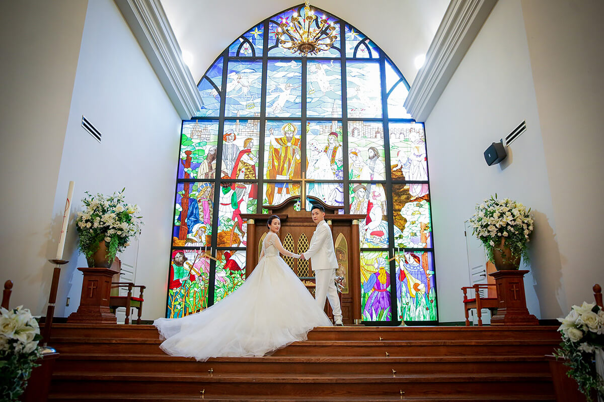 ステンドグラスが綺麗な大聖堂で、ご家族中心の結婚式。ゲストに参加していただける人前式スタイルで、お二人が誓いを交わすシーンはアットホームは雰囲気に包まれました。いつも笑顔のお二人ですが、当日の笑顔は今までにないほど輝いており、ゲストに、そしてスタッフにも幸せ気分をおすそ分けしてくださいました。