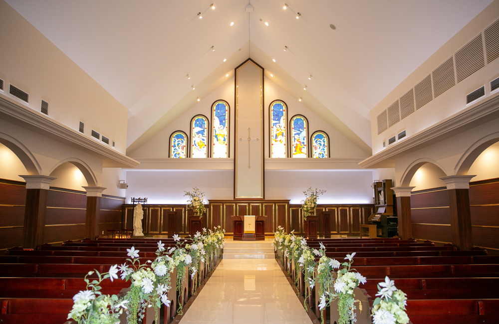 緑豊かな錦ケ丘の森に佇む、荘厳な大聖堂を備えた気品あふれる迎賓館。天井が高く、息をのむ美しさのステンドグラスを誇る大聖堂は圧巻。三角の天井とステンドグラスがアクセントの荘厳なチャペルでもあり、チャペルの大階段は新婦の憧れスポット。ブーケトスやフラワーシャワーなどでご利用可能です。JR「仙台駅」から車で20分とアクセスの良さも魅力です。