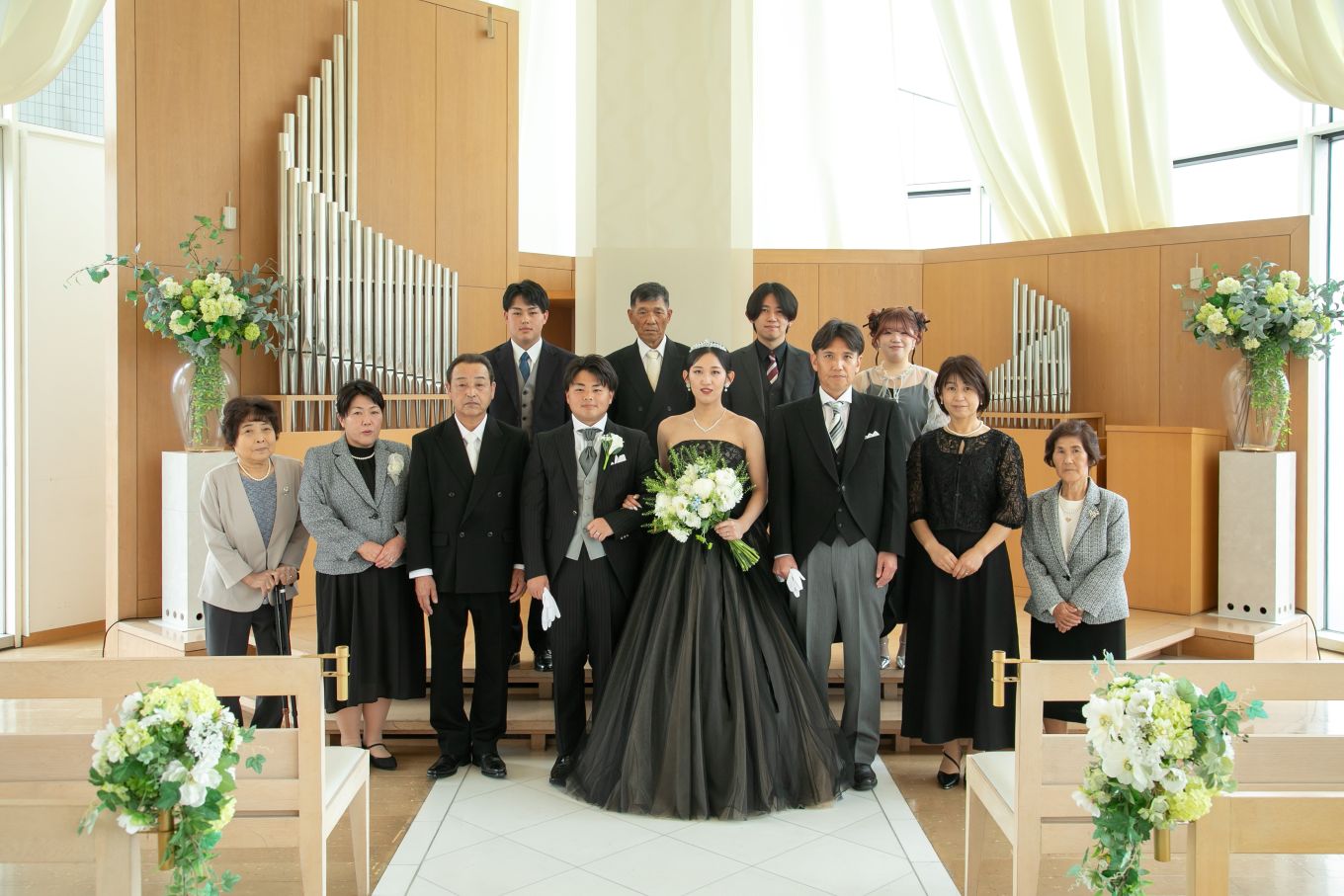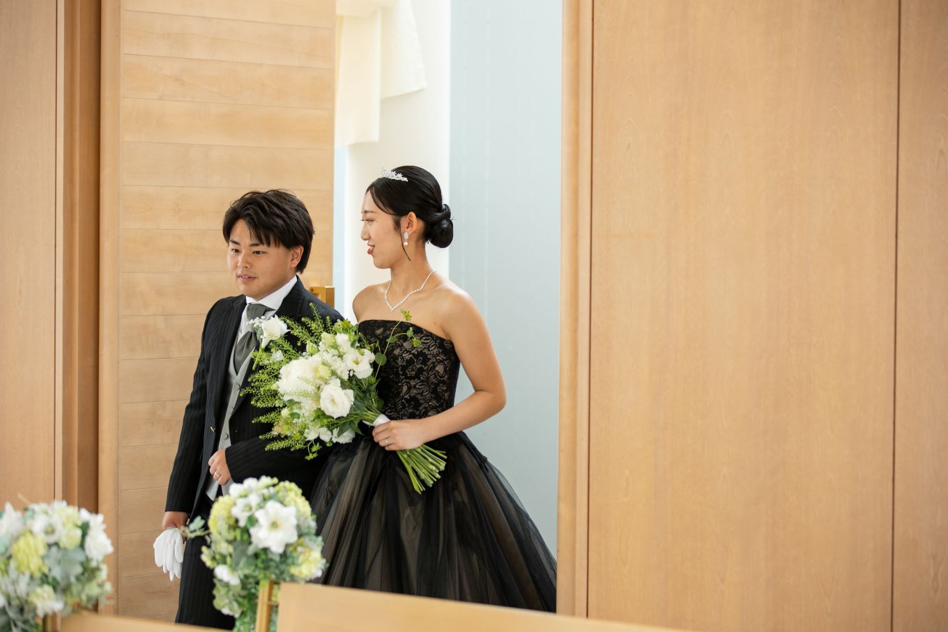 結婚式といえば、ウェディングドレス。 皆様が想像されますが、実は結婚式後にチャペルでお色直しが出来るドレスもご用意しております。 『オーバーカラードレス』であればお着替えは1分。 チャペルに再入場して頂き、お写真撮影もさせて頂きました。