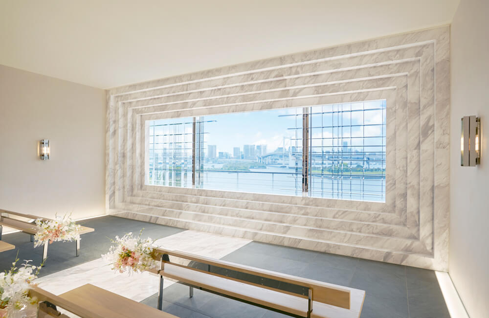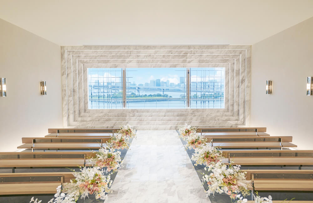 お台場・デックス東京ビーチにある、小さな結婚式 お台場チャペルは、 都心の騒めきから一歩踏み込めば自然光を感じる、光と海の水面が織りなすチャペル。 素材を大事にした、木材・石材・アート・植物など本物を使った上質なしつらえ。 ステンレス格子に複雑に映り込む光と海と東京の景色。 時間の流れと共に変化するチャペル、夜には東京の夜景映り込みロマンチックなナイトウェディングが叶います。 併設されたレストラン会場で挙式後の会食・パーティも行なっていただけます。