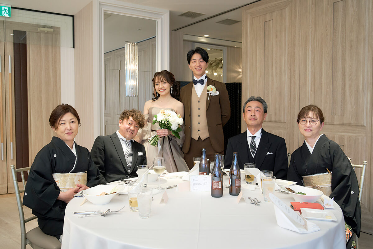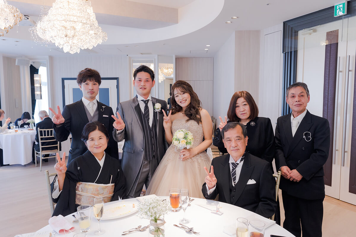 小さな結婚式横浜チャペルで挙式をされたおふたり。まずはファミリーミートでご両親へ感謝を伝え、感動のひとときに。挙式後はカラードレスにお色直しし、会食ではファーストバイトで大盛り上がり!家族みんなの笑顔があふれる、温かい時間を過ごされた素敵なウェディングでした。