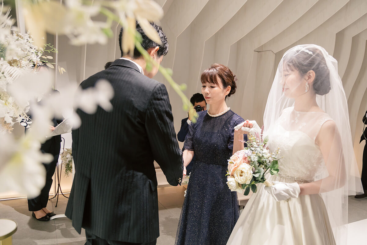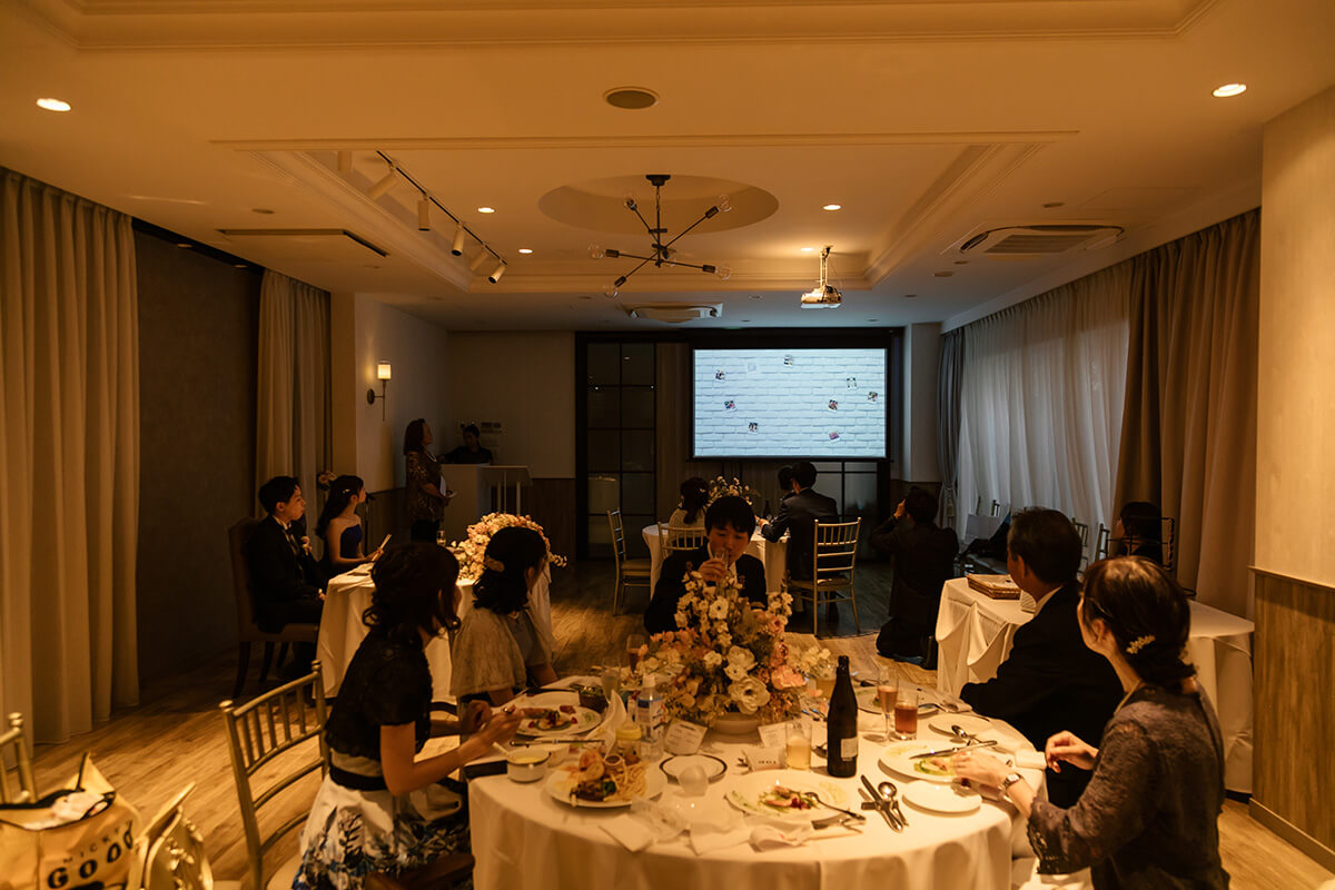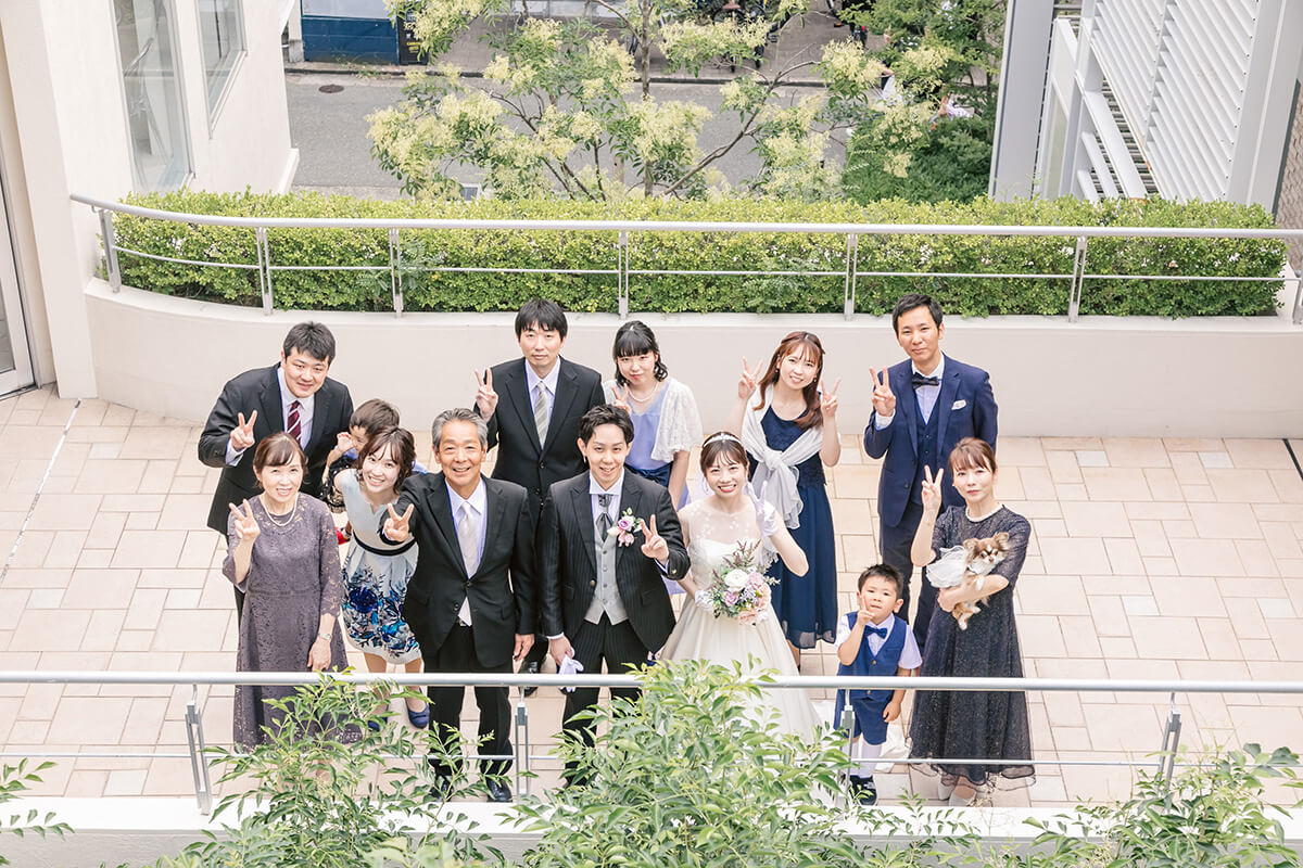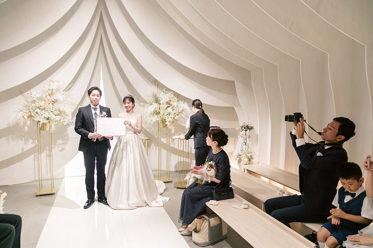 ワンちゃんが指輪を運ぶリングドッグとして登場し、さらには結婚証明書の証人として大切な役割を果たしました。温かな笑顔に包まれる中、披露宴ではサンクスバイトでお母様へ感謝の気持ちを伝える感動のシーンも。大好きな家族とワンちゃんに見守られた、心温まるアットホームな結婚式となりました。