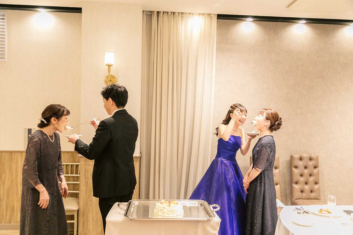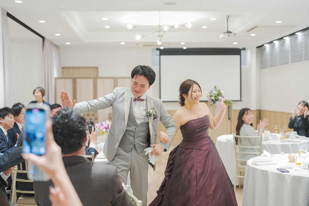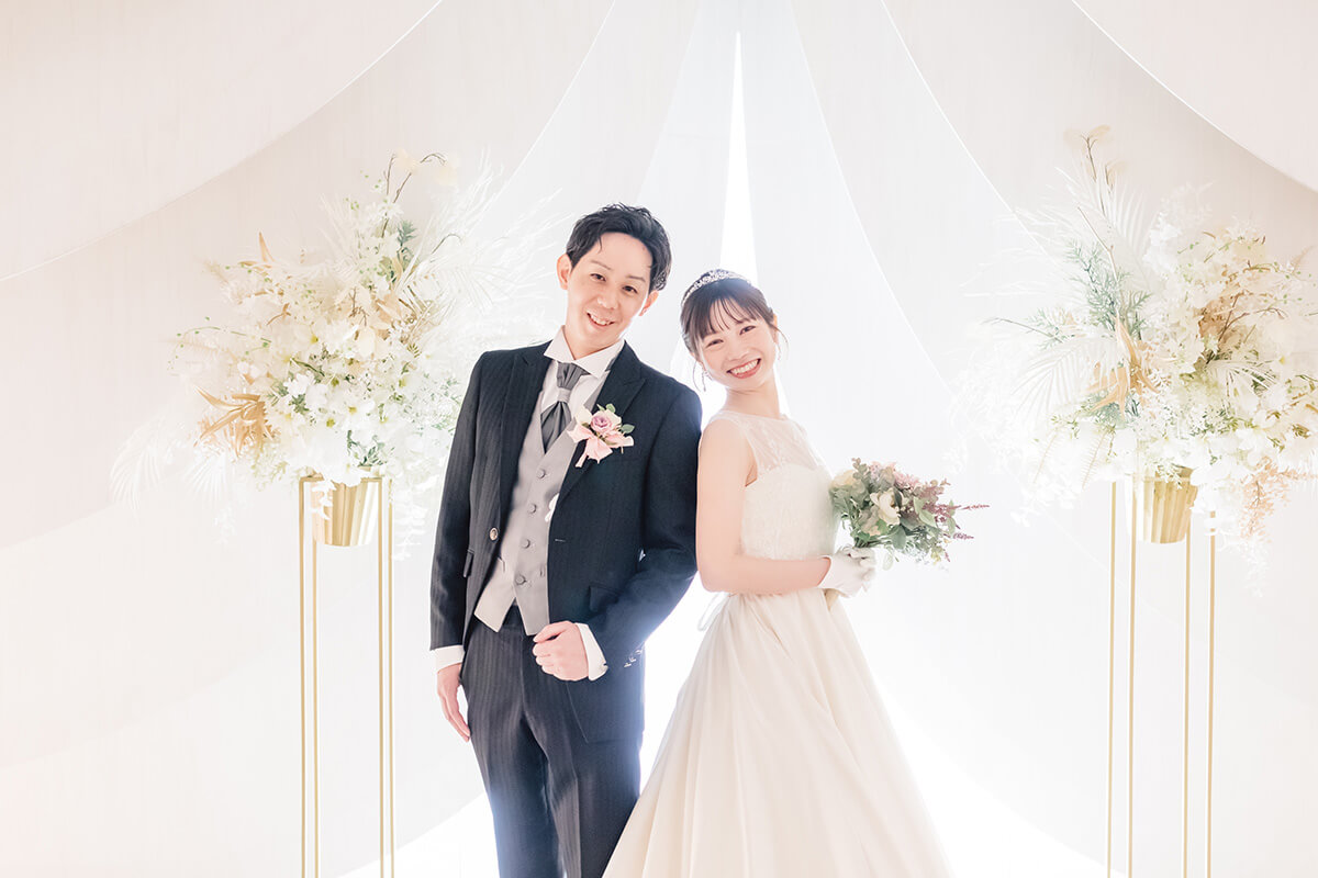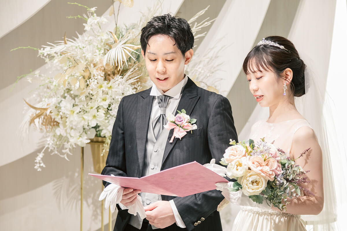ワンちゃんが指輪を運ぶリングドッグとして登場し、さらには結婚証明書の証人として大切な役割を果たしました。温かな笑顔に包まれる中、披露宴ではサンクスバイトでお母様へ感謝の気持ちを伝える感動のシーンも。大好きな家族とワンちゃんに見守られた、心温まるアットホームな結婚式となりました。