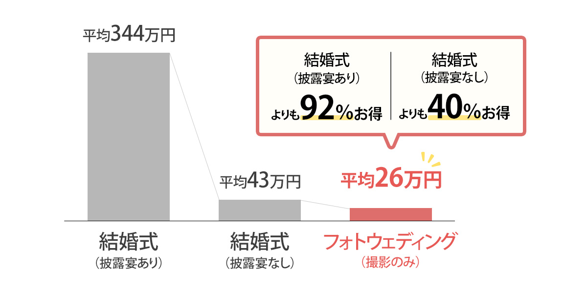 フォトウェディングの平均費用は26万円。対して結婚式の場合、挙式のみ(披露宴を含まない)だと平均43万円※で、挙式と比べて約6割ほどまで費用を抑えることができます。