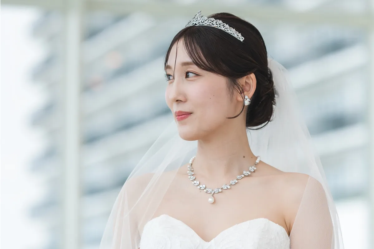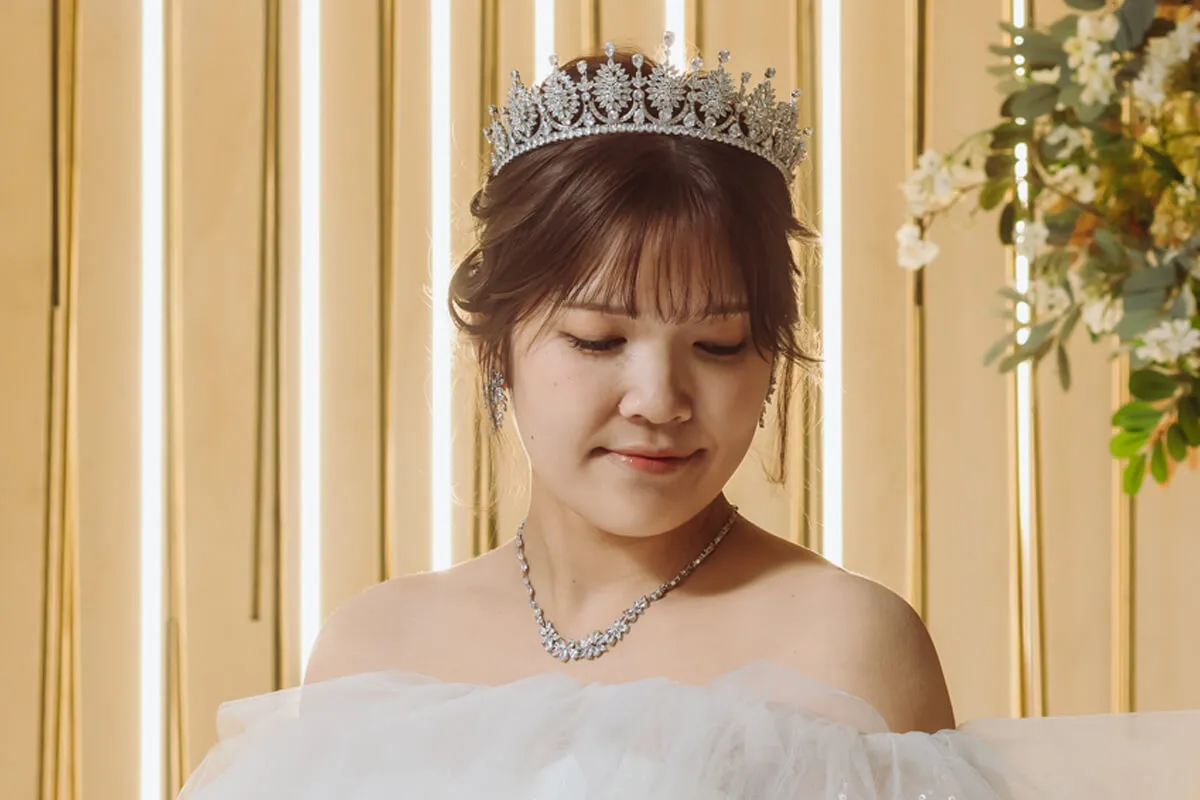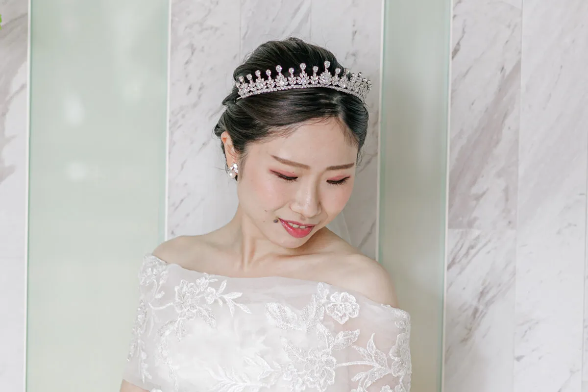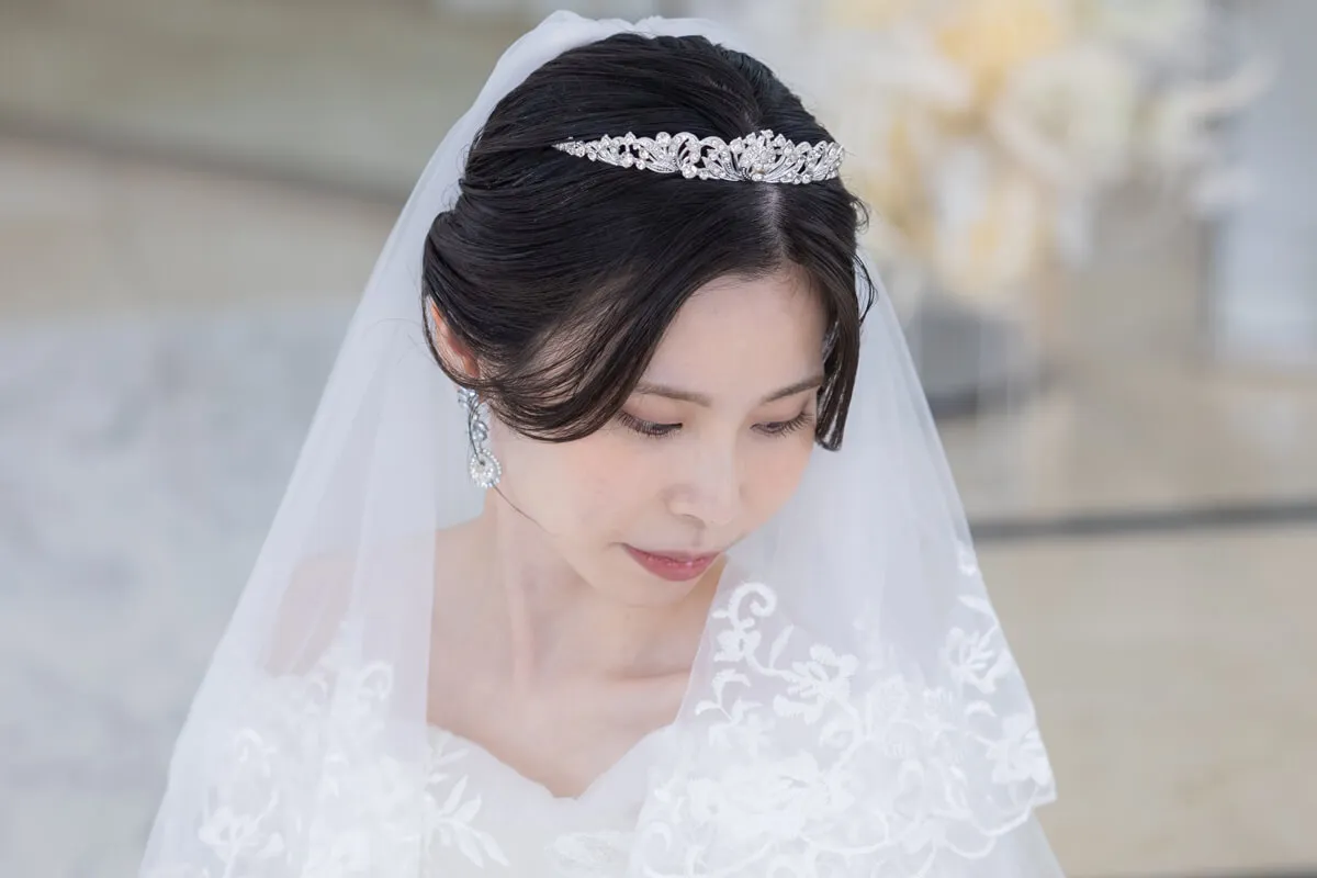 煌めくティアラが、花嫁の特別な一日を気品あふれる装いへと導きます。繊細なデザインと優美な輝きが、上品で洗練された印象を演出。王妃のようなエレガンスを纏い、最高の瞬間を彩ります。