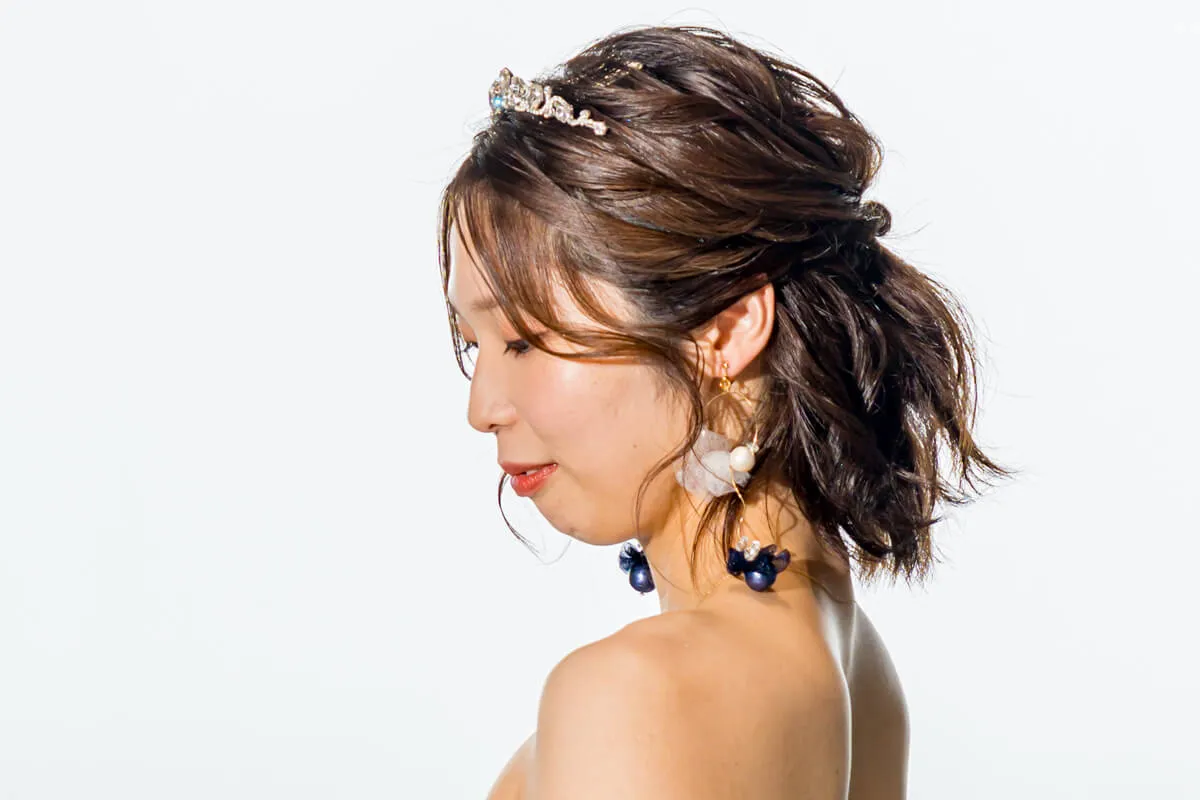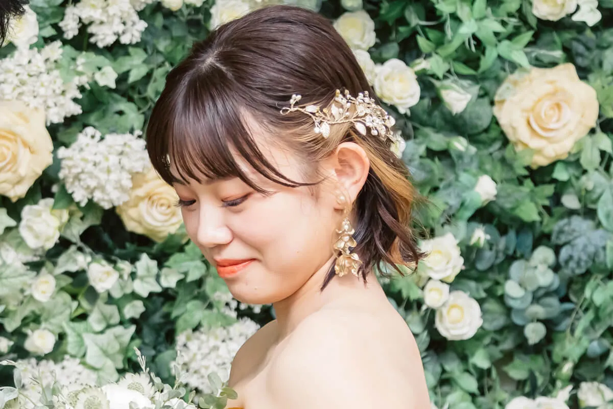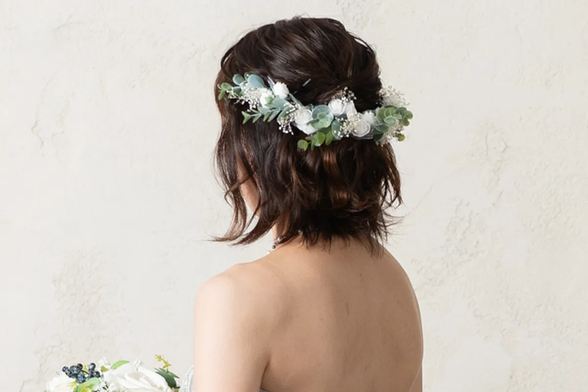 コンパクトなシルエットで顔立ちを美しく際立たせ、イヤリングやティアラなどのアクセサリーとの相性も◎。トレンド感もありながら、可憐で上品なスタイルを楽しめます。