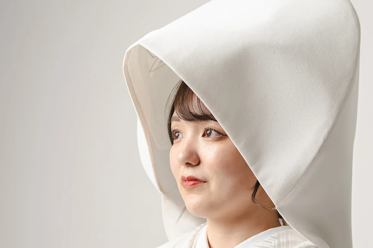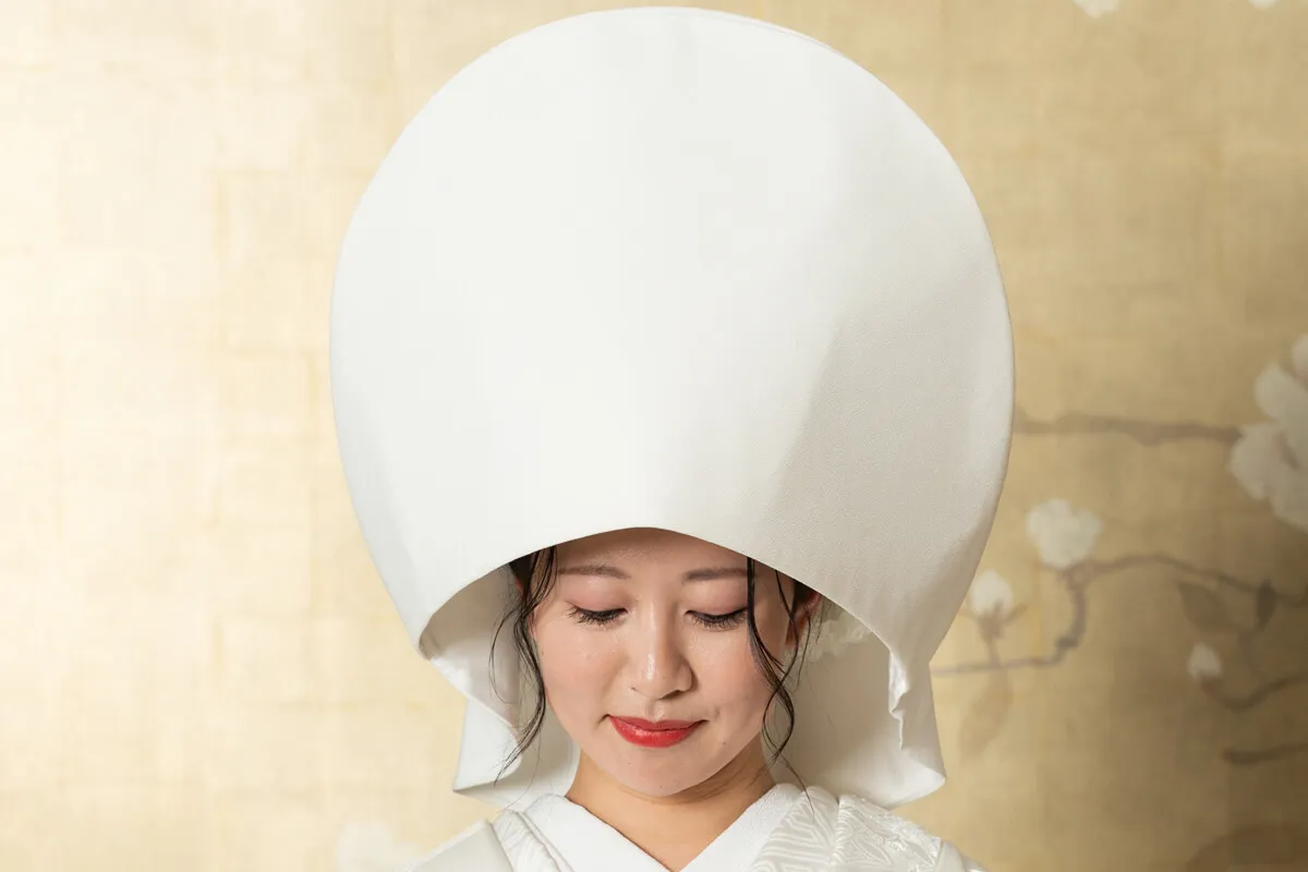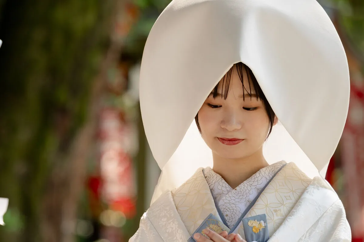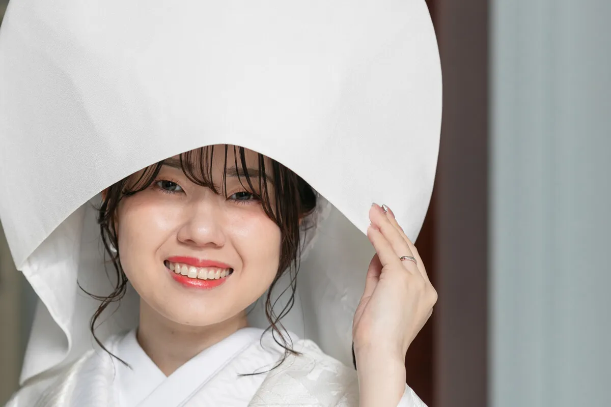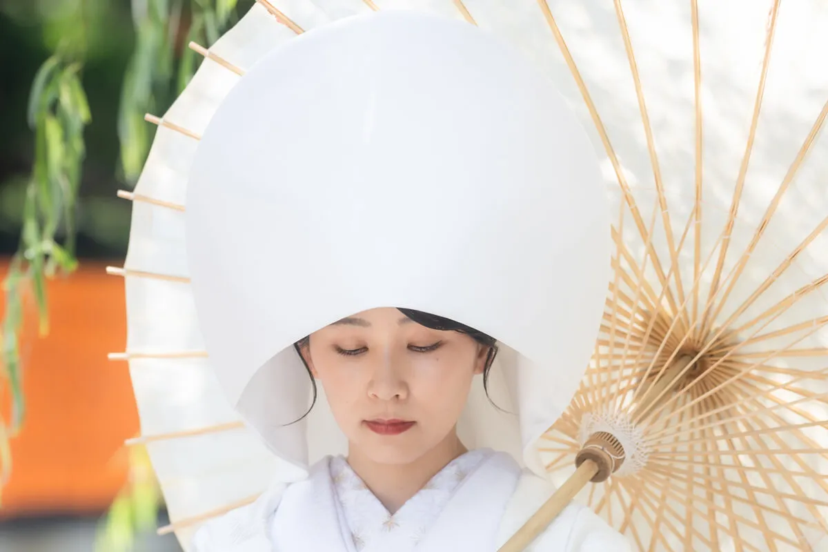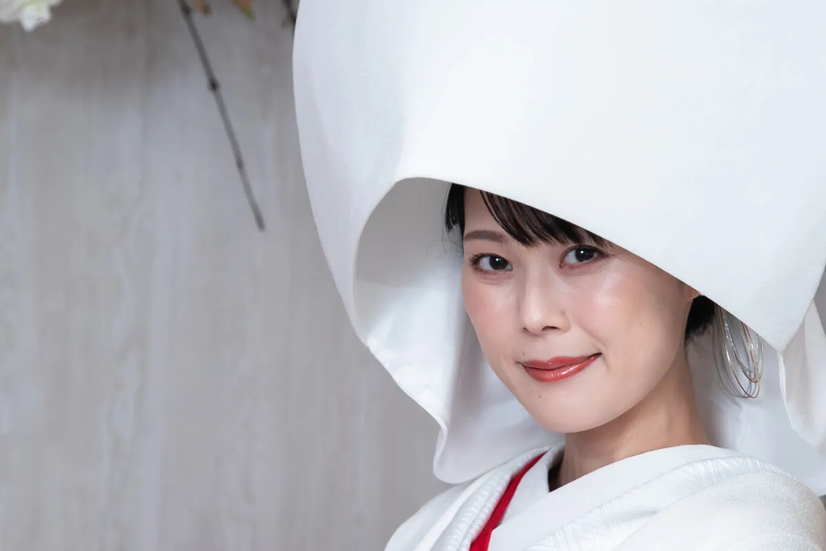 日本の伝統美を象徴する白無垢と綿帽子。花嫁の清らかさと気品を際立たせる組み合わせで、凛とした和の雰囲気を演出します。人気の神社婚や和のフォトウェディングにおすすめ。