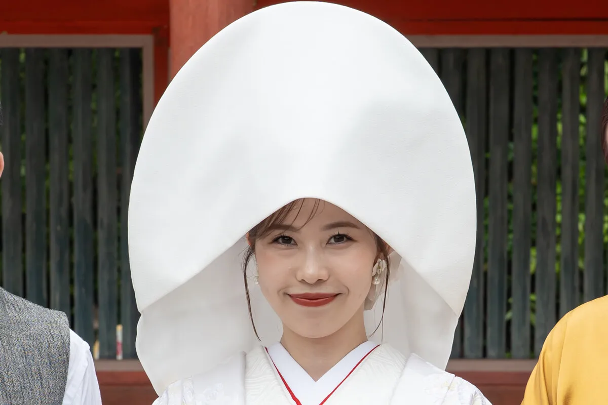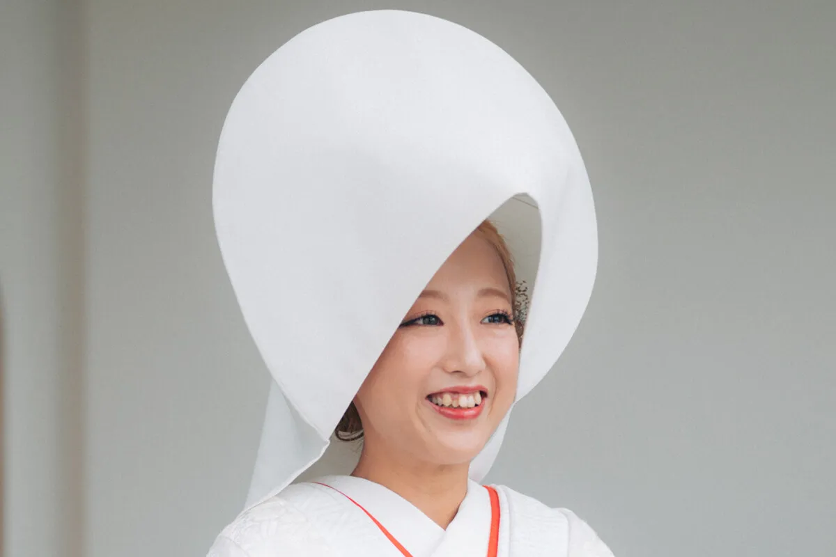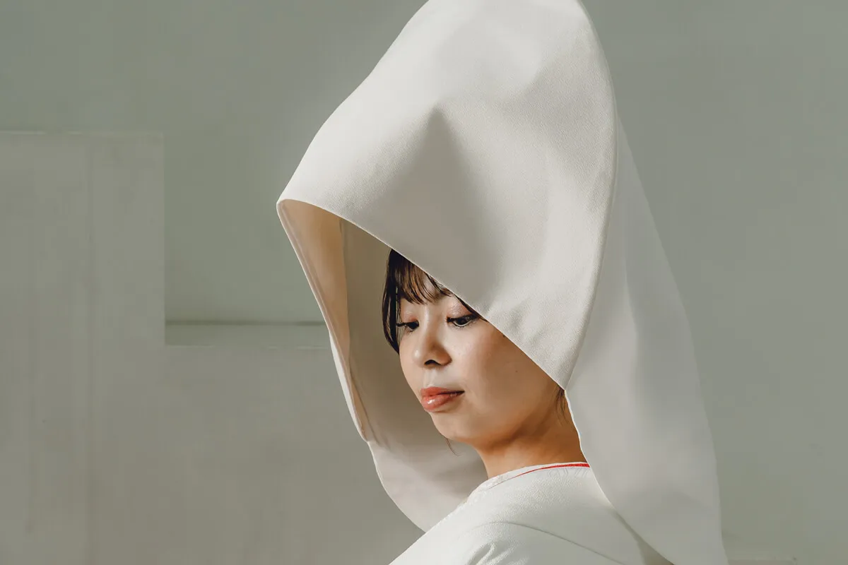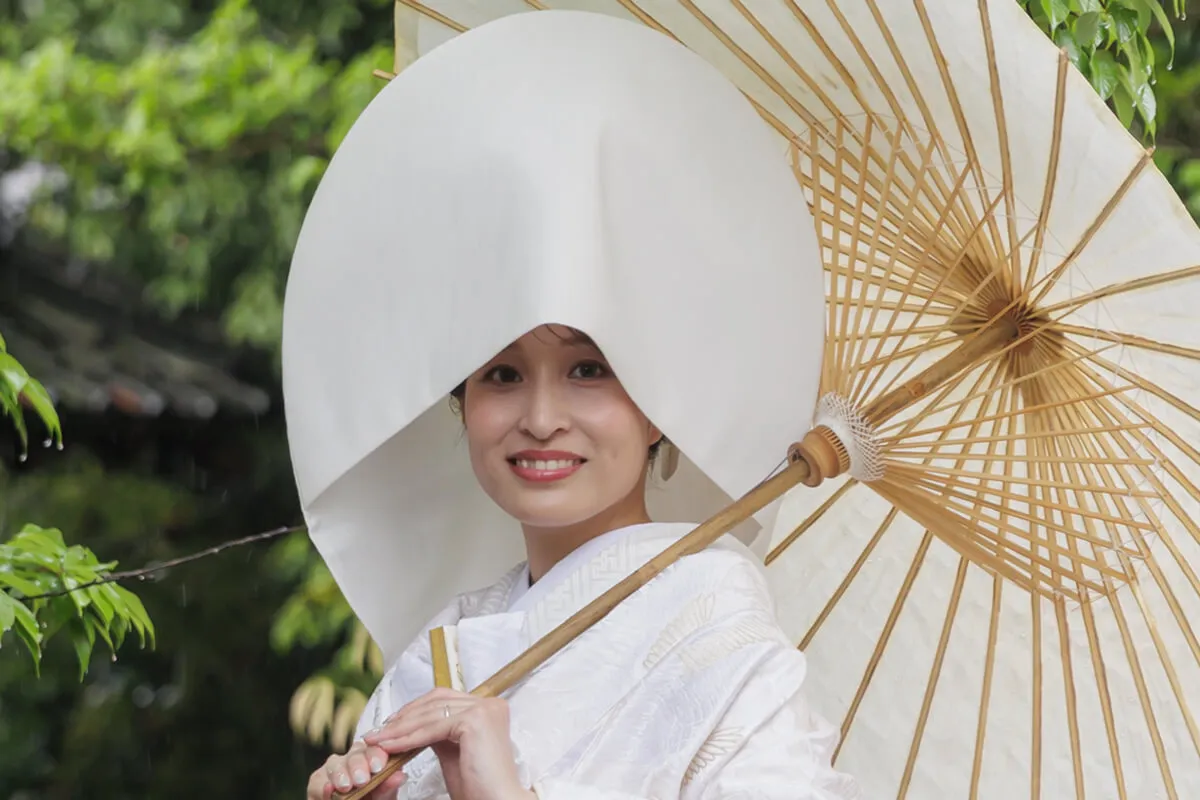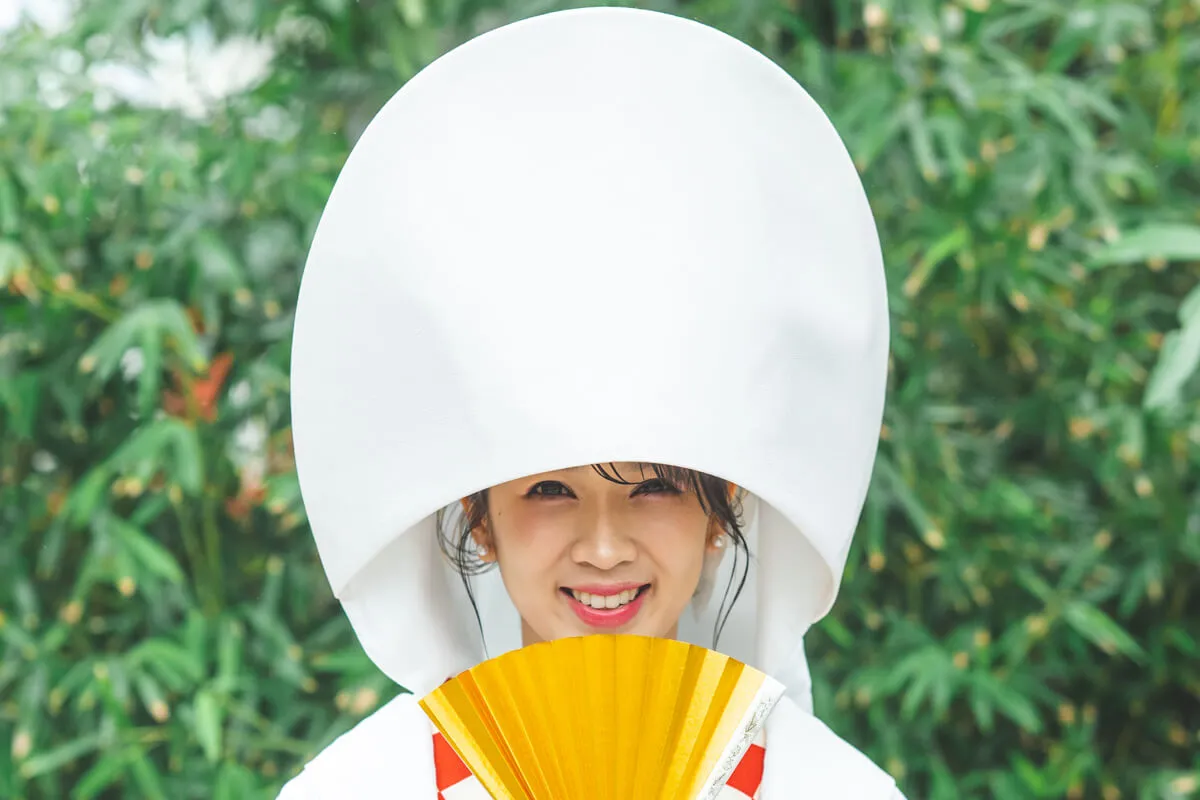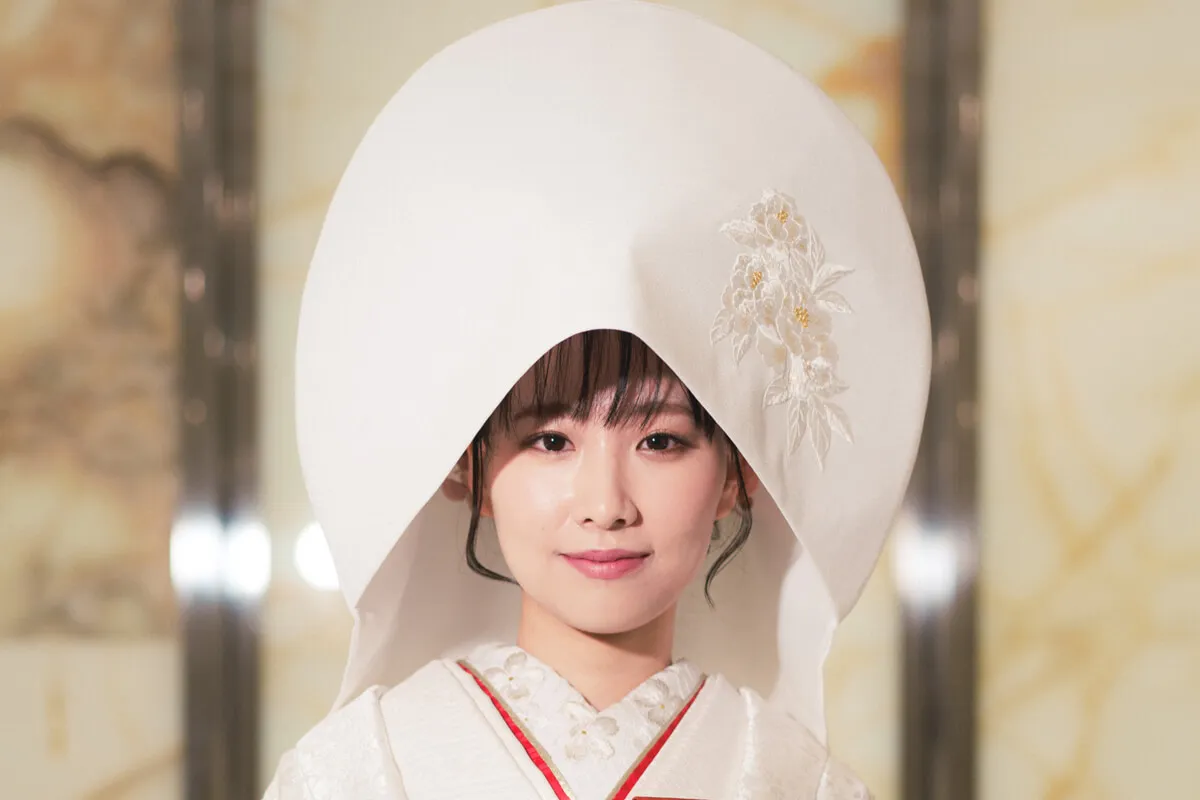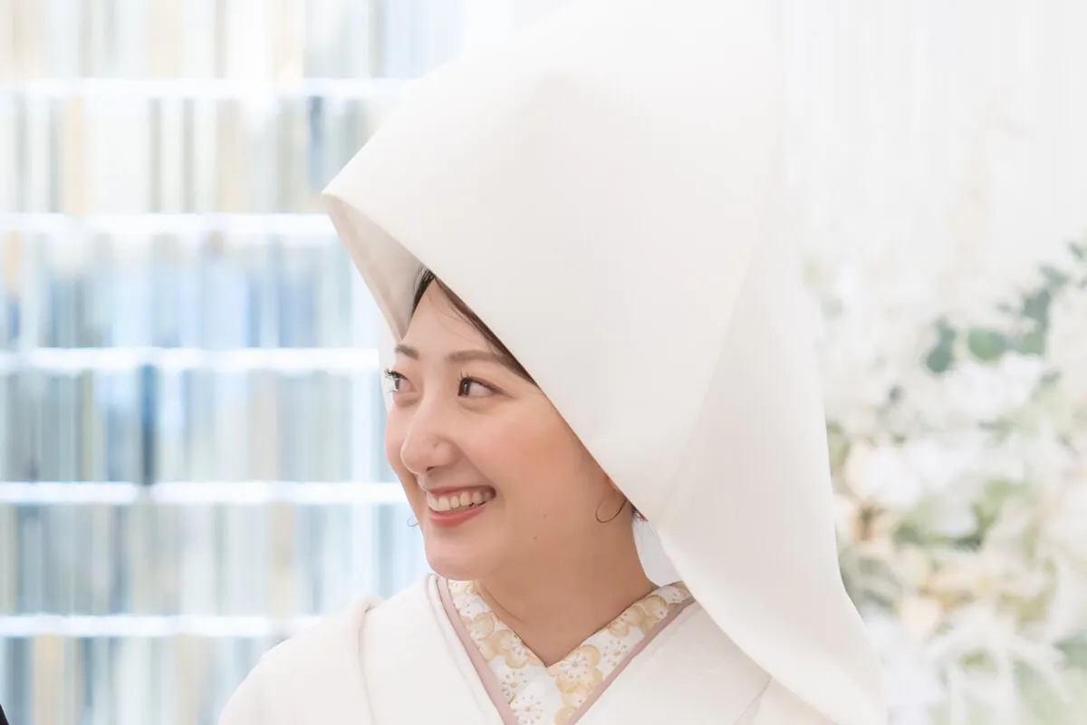 日本の伝統美を象徴する白無垢と綿帽子。花嫁の清らかさと気品を際立たせる組み合わせで、凛とした和の雰囲気を演出します。人気の神社婚や和のフォトウェディングにおすすめ。