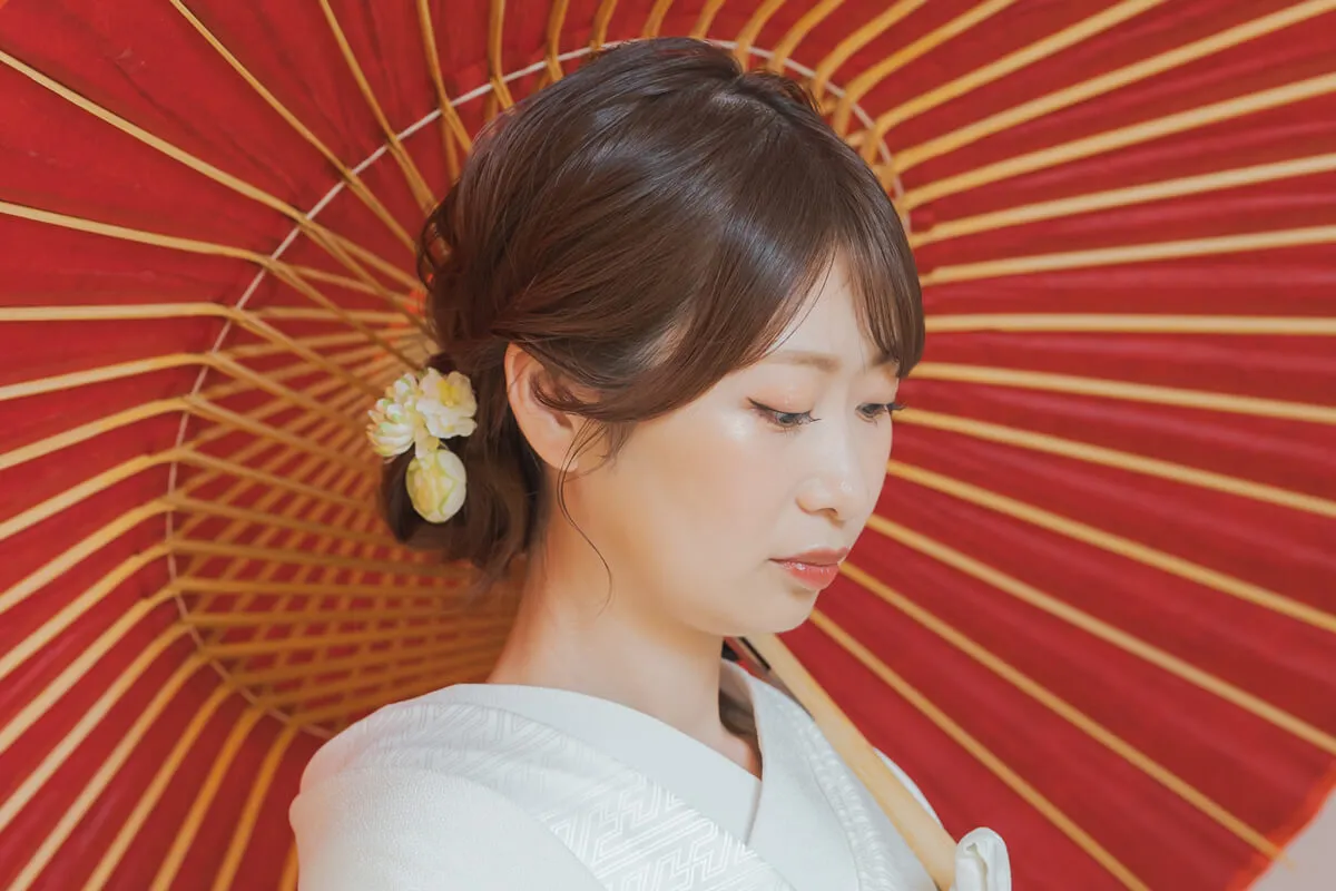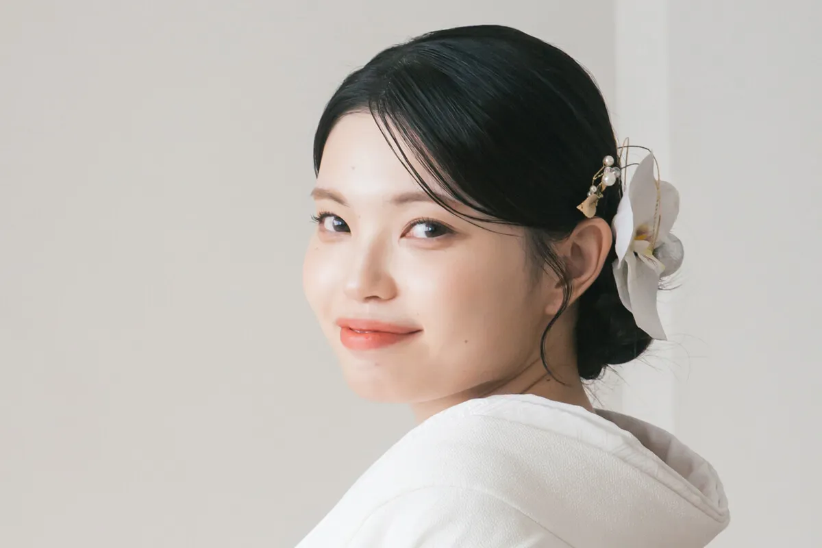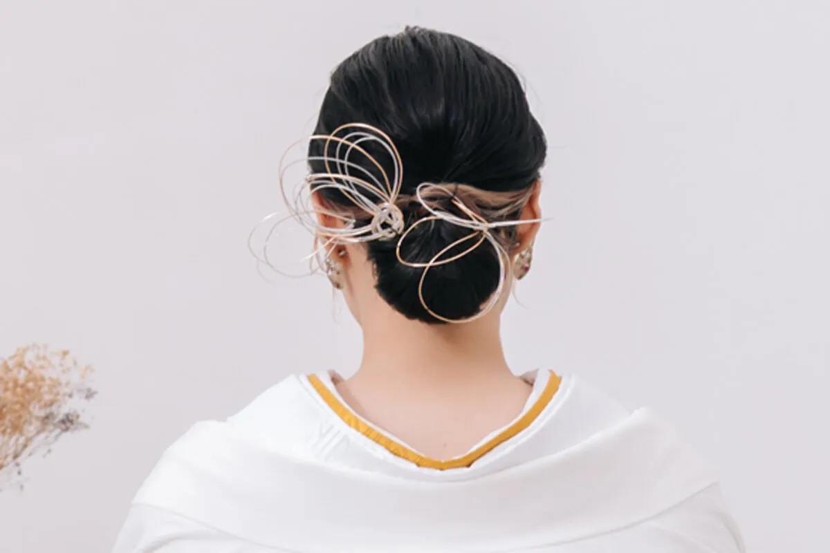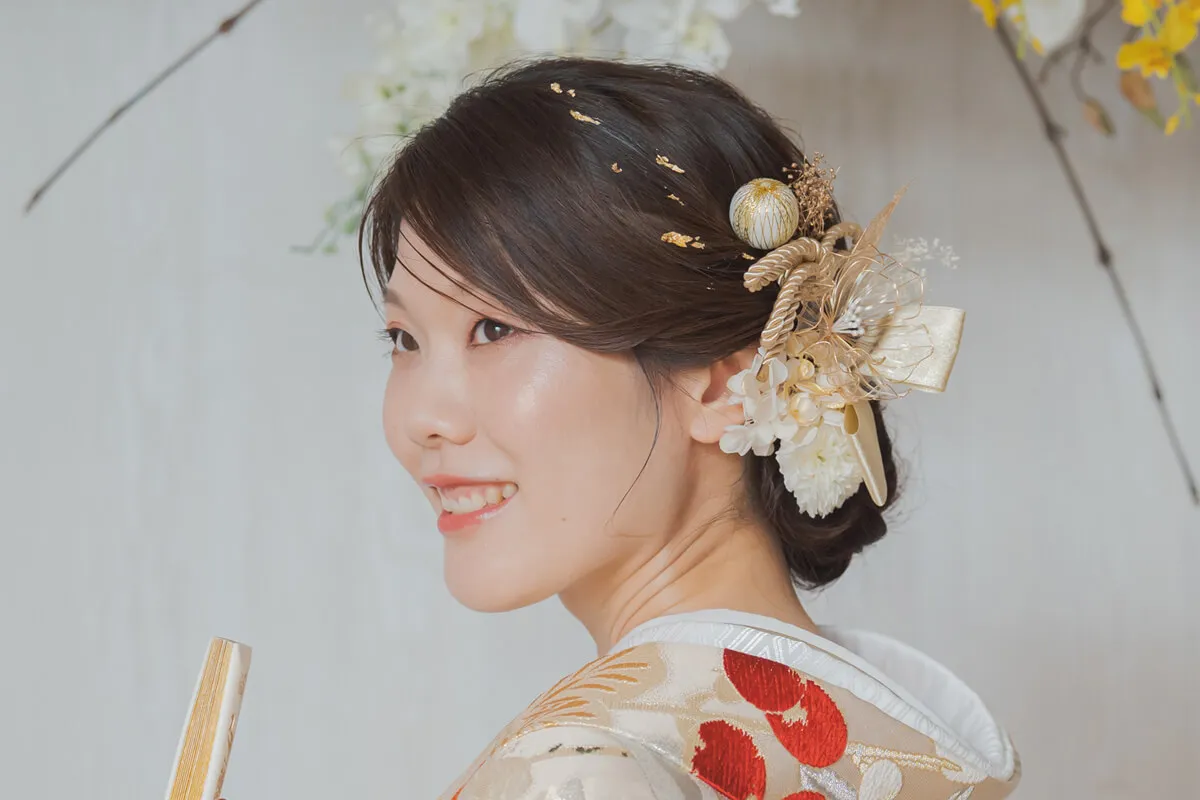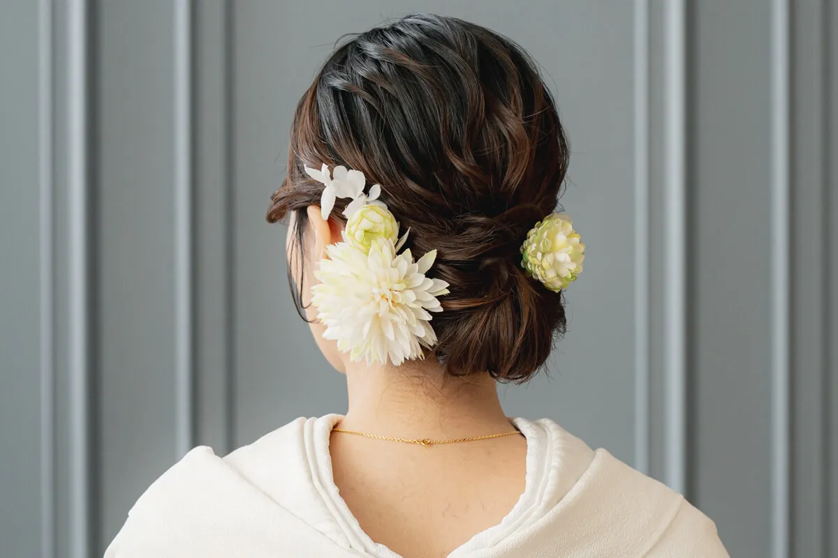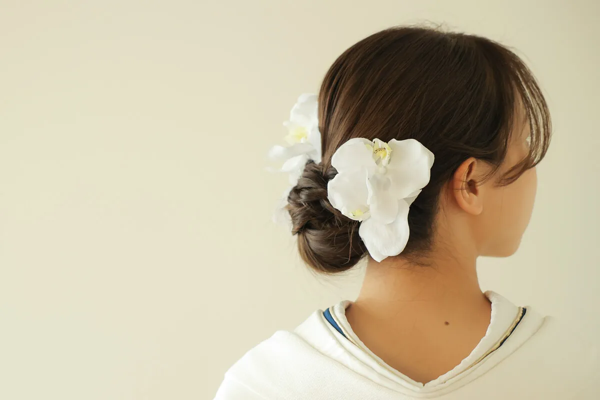 白無垢や色打掛に合わせて、凛としたシニヨンや華やかなまとめ髪が人気。かんざしや生花を組み合わせれば、和装結婚式からモダンなフォトウェディングまで幅広く対応できます。