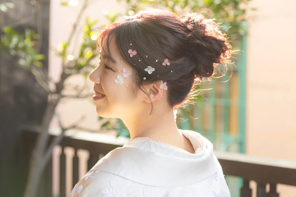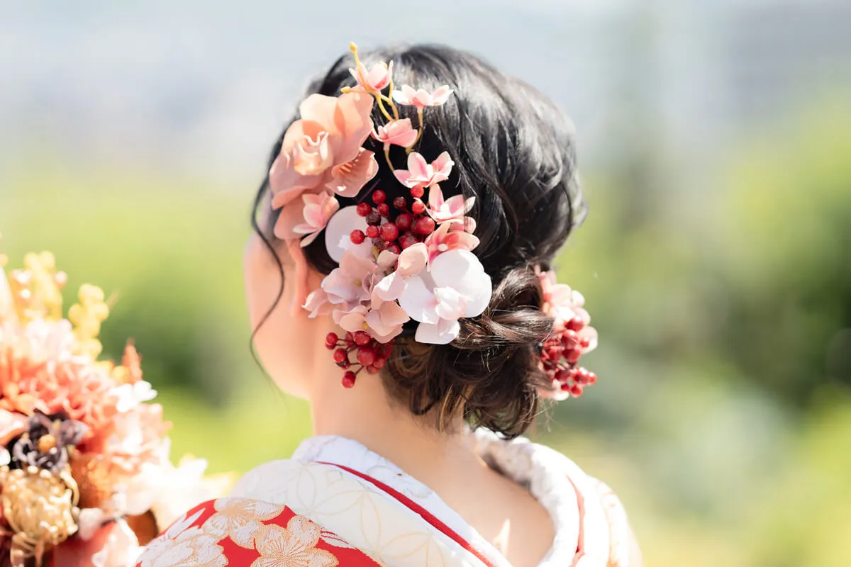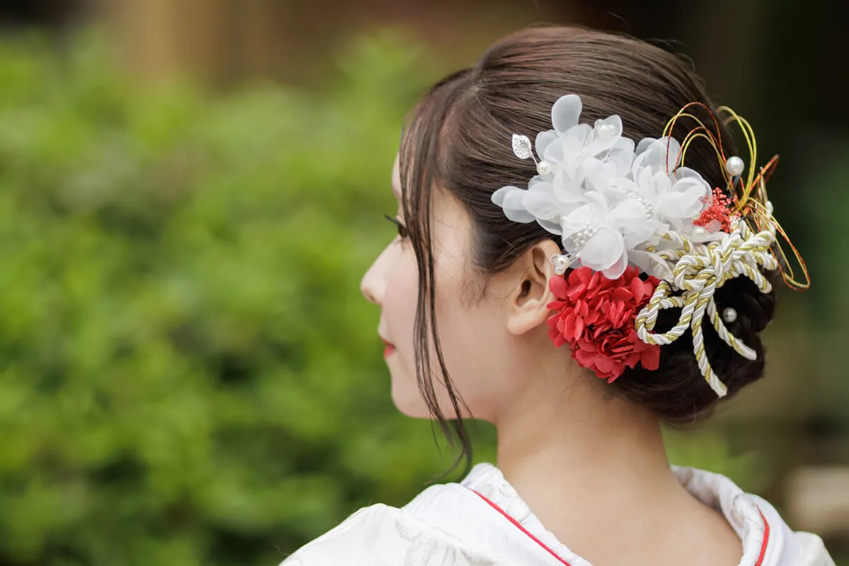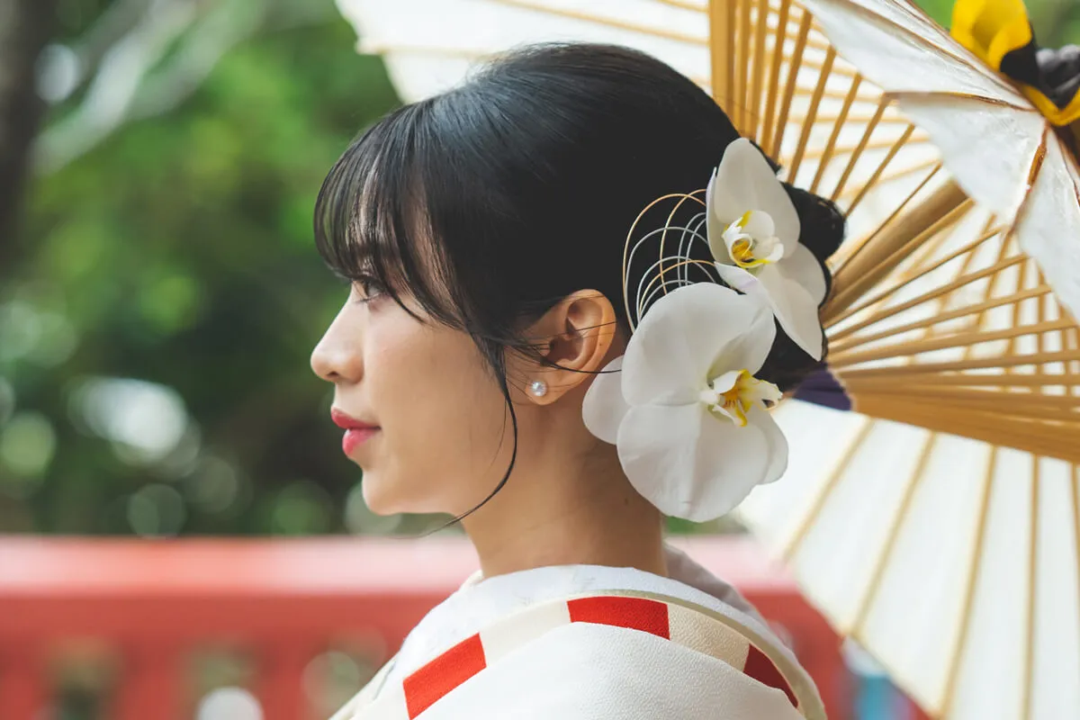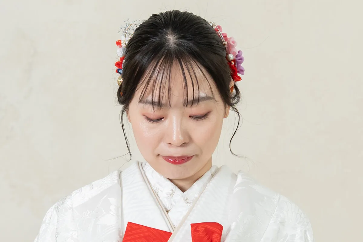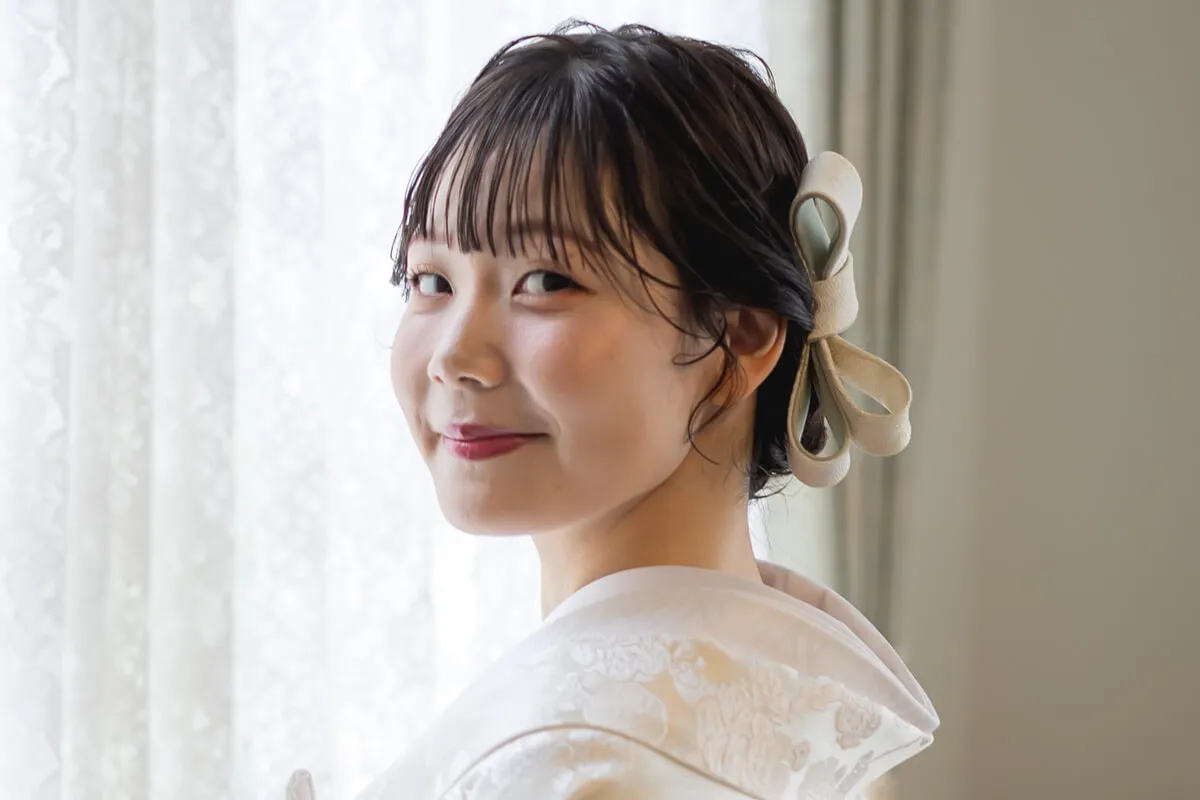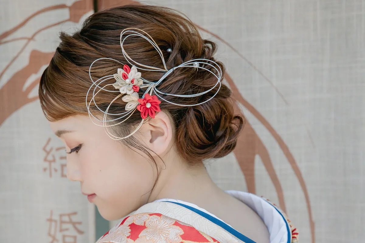 白無垢や色打掛に合わせて、凛としたシニヨンや華やかなまとめ髪が人気。かんざしや生花を組み合わせれば、和装結婚式からモダンなフォトウェディングまで幅広く対応できます。