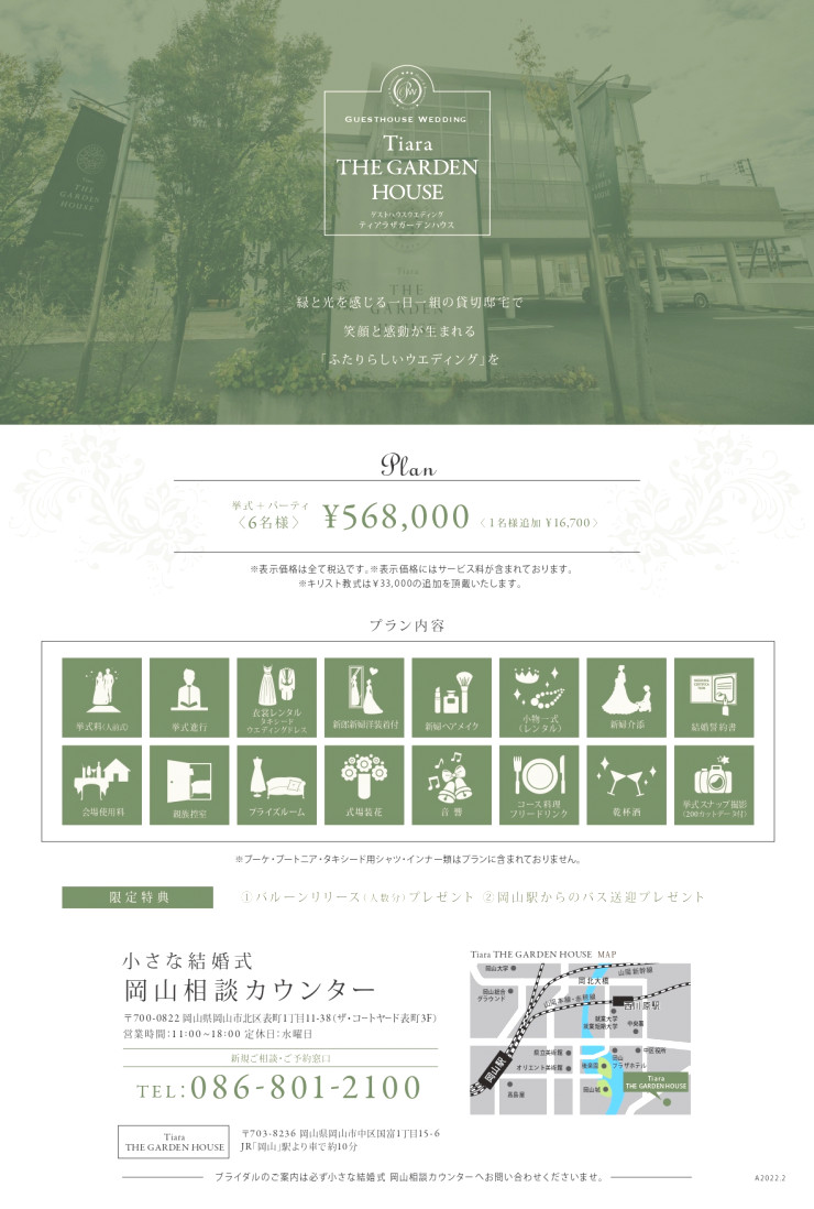 小さな結婚式岡山店とティアラザガーデンハウスが少人数の結婚式を応援いたします。