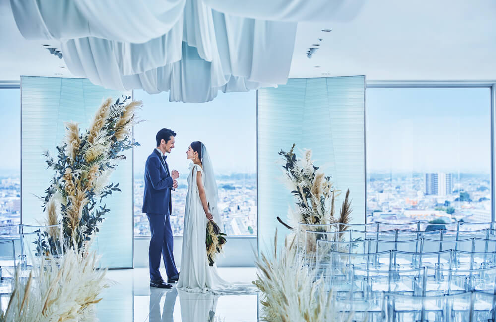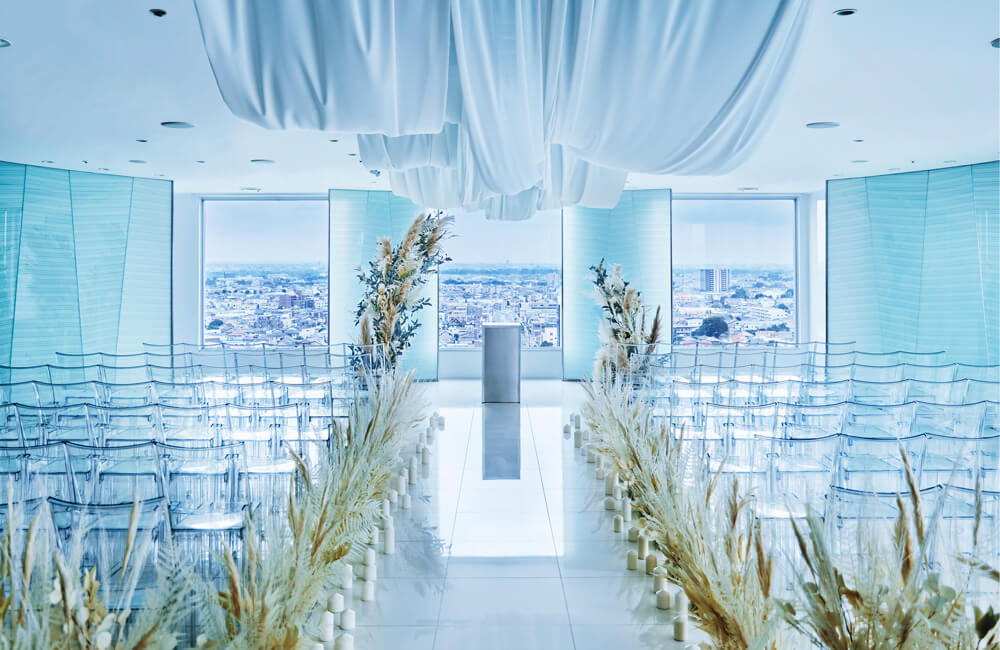 大宮駅から徒歩5分ほど。地上95mの高層に位置する「SAKURA SKY PALACE」。セレモニーの舞台は180度近い大パノラマが広がり、まるで天空に浮かんでいるようなチャペル。眼下に広がる大宮の街並みはもちろんのこと、東京の高層ビル群や富士山を望むことができます。歩みを進めるおふたりを陽光が輝かせ、青空やサンセット、煌めく夜景など、その瞬間だけの情景が感動のシーンを演出。ゲストの記憶に残る美しいひとときとなるでしょう。パーティ会場は洗練されたアーバンモダンな空間。パノラマビューの他にも、窓から射し込む光で輝くクリスタルシャンデリアや、臨場感溢れるオープンキッチンも魅力です。大切なゲストに上質なおもてなしをご提供いたします。ここにしかない、大人のスカイウエディングが叶います。