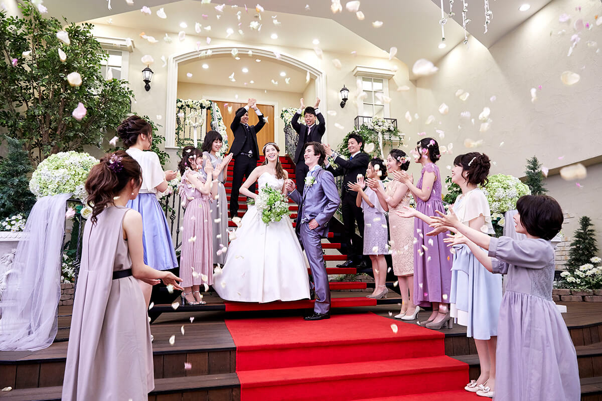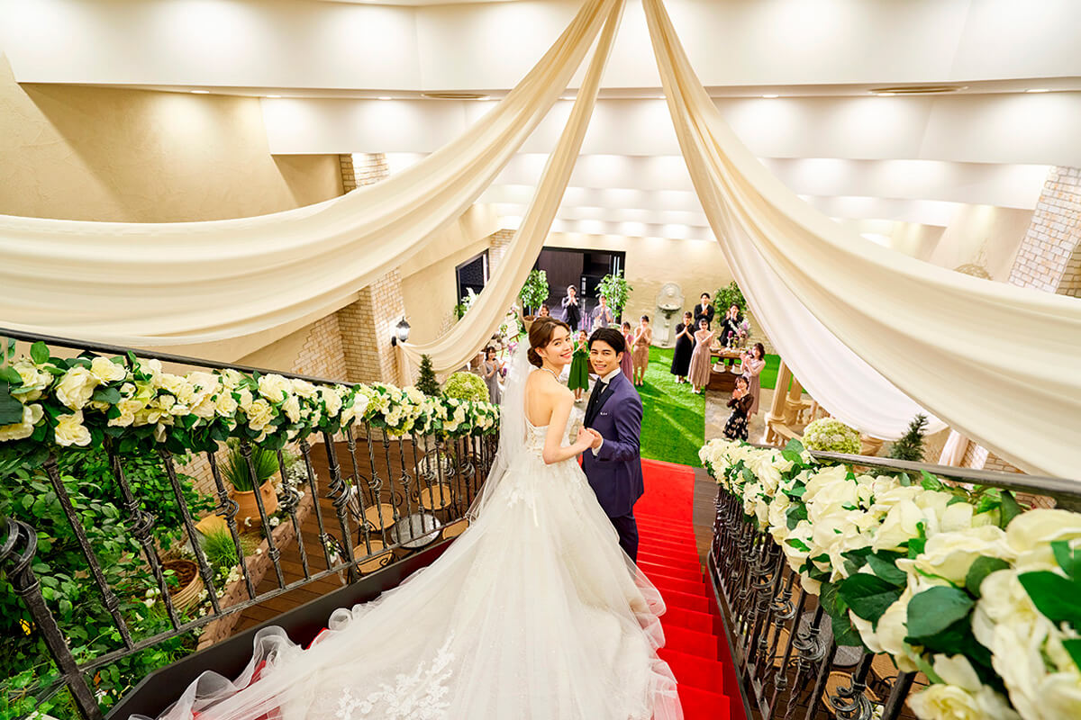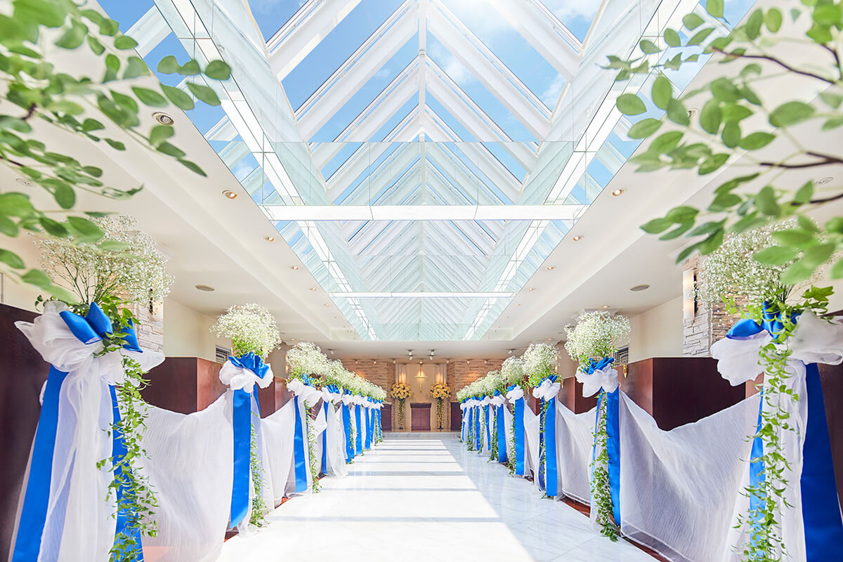 埼玉県川口市の結婚式場「ベルヴィ武蔵野」。最上階のチャペル「St.セレスティン」は、天空という名の光り輝くウェディングの舞台。新婦さまが入場すると初めて天井のカーテンが開き、総ガラス張りの天井から自然光が降り注ぎます。温もりを感じさせる調度品と白い大理石をあしらったバージンロードが、ドラマティックなセレモニーを演出します。挙式後は隣接する全天候型のプライベートガーデンへ。レッドカーペットが敷かれた大階段をゲストの祝福を受けながら降りることができます。水に囲まれた神秘の神殿「水凛」で執り行われる伝統的なスタイルの挙式も家族との絆を深めるひとときに。パーティは大小5つの会場から、おふたりの好みやゲストの人数に合わせ様々なご提案が可能です。おふたりの門出を、光と祝福が彩る式場です。