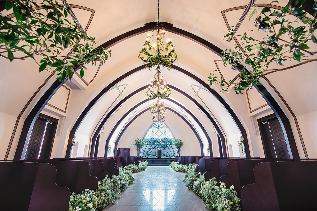 自然光が差し込み、木の温もりが感じられる優美なチャペルは、大切なご家族様との挙式にぴったりの落ち着いた空間です。木々と光に祝福されながら、大切な人々との特別な瞬間を過ごせます。また、プール付きガーデンでは、華やかで自由な演出も叶えられ、明るく温かみのある雰囲気の中で、心に残るウェディングを実現します。