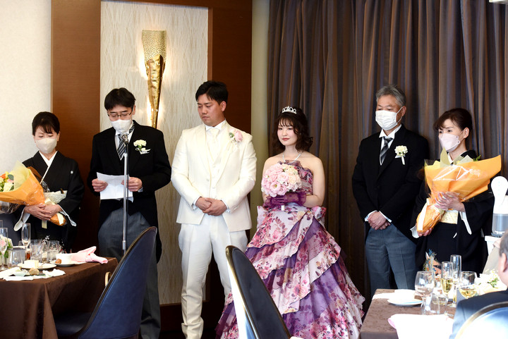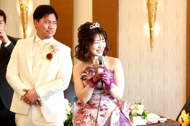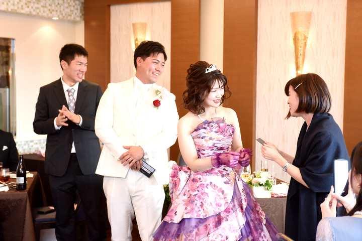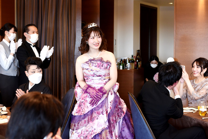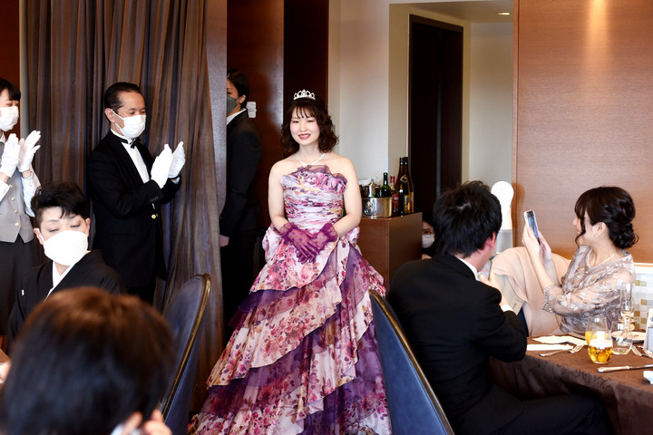 ピンクパープルの華やかドレスに身を包みご入場された新婦様。