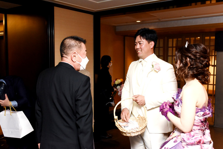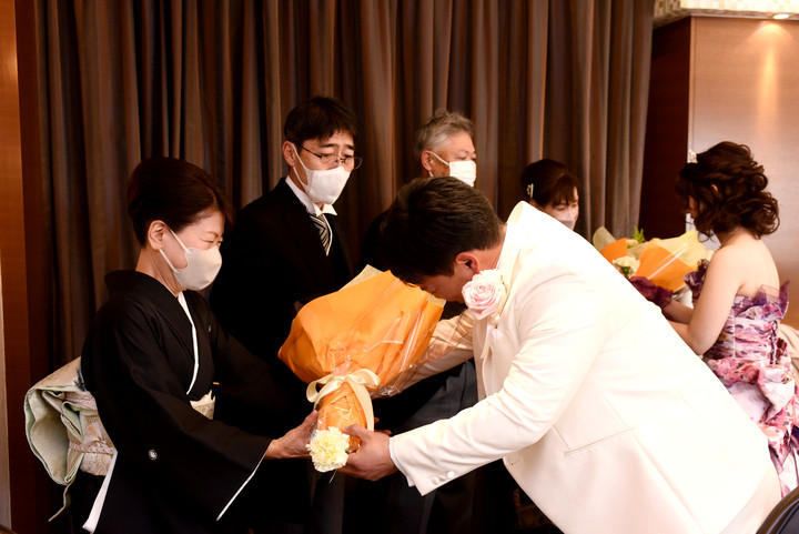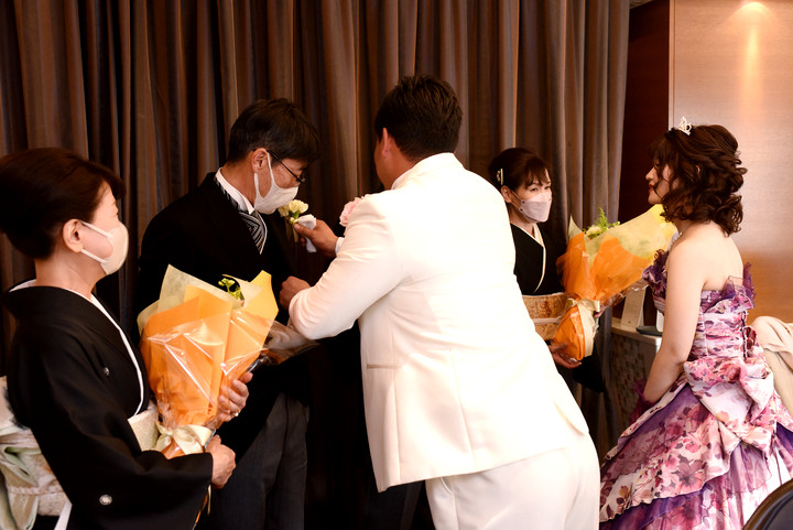 お返事を花束から一輪抜き取り、新郎様の胸ポケットへ贈ります。