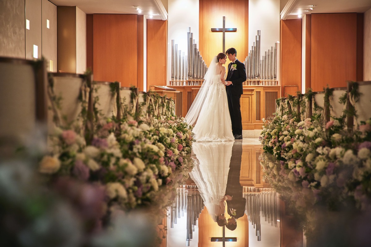 【上質で温かみのある挙式空間 】大理石のバージンロードが美しく輝くチャペルは、花嫁姿をより華やかに演出。 木のぬくもりを感じる落ち着いた空間のため、ゲストとの距離が近く、アットホームな挙式が叶います。 パイプオルガンや聖歌隊の音色も印象的で、記憶に残るセレモニーを実現できます。