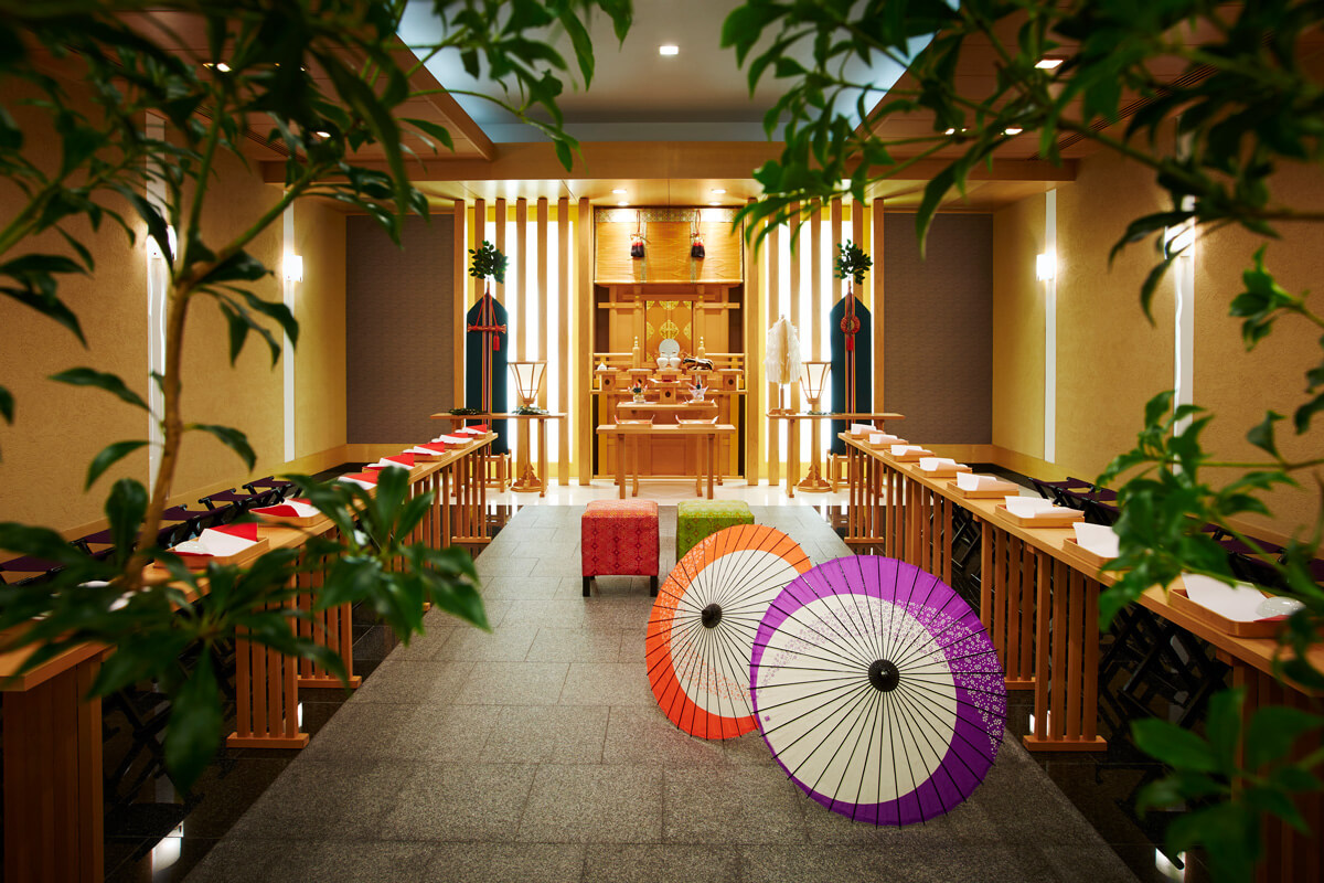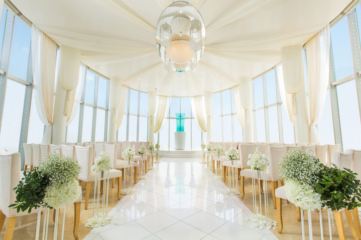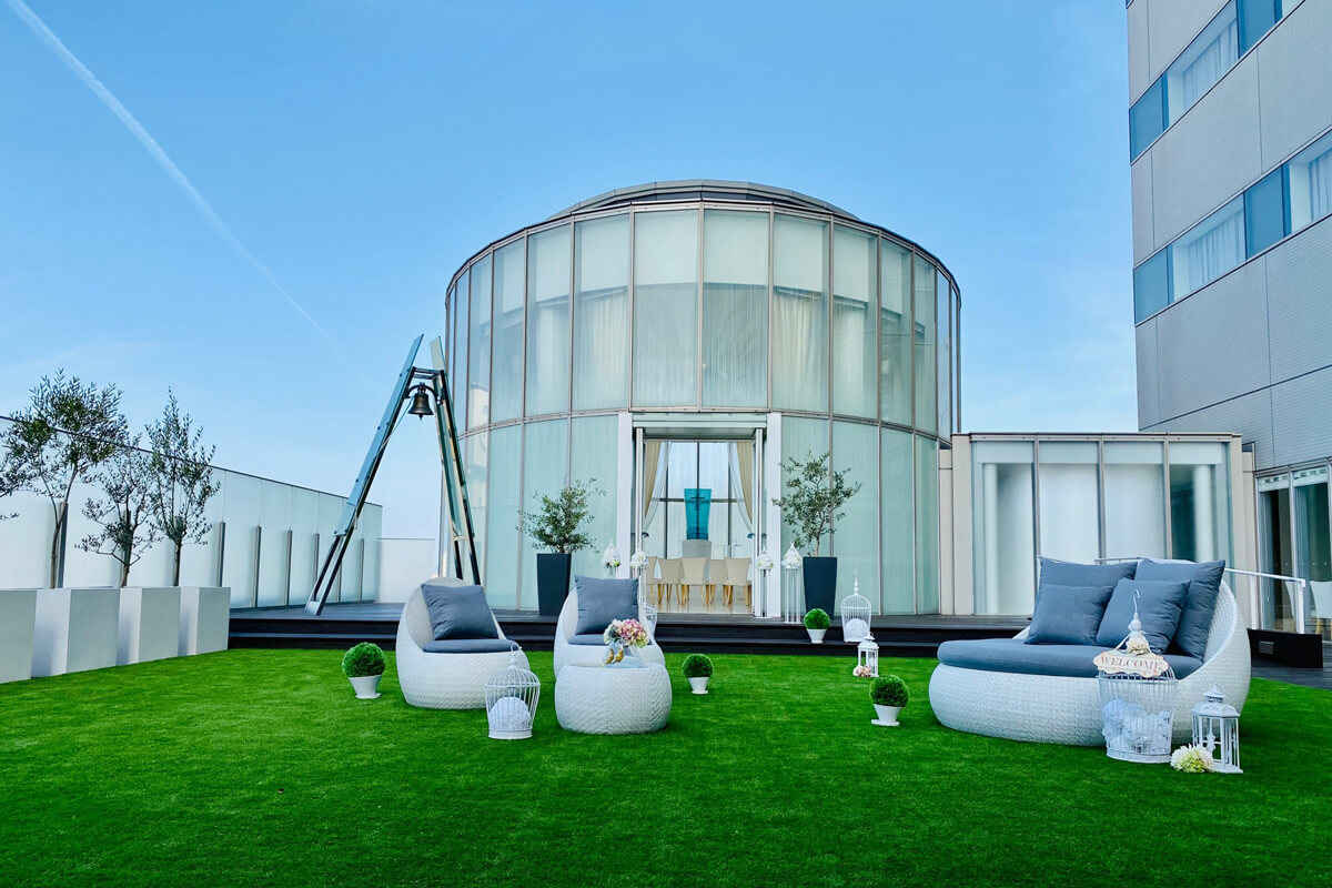 360度、青空広がるガラスの独立型チャペル。優しく降り注ぐ自然光がバージンロードを照らし花嫁をより一層美しく輝かせます。生演奏の美しい音色に包まれる空間はいつまでも色褪せない感動的なシーンに。 四季の彩りと美しさを、繊細かつ大胆な技で、食を通して伝える“和食ダイニング「廚洊・くりやせん」は少人数パーティにふさわしい和モダンなあつらえ。おふたりとゲストの距離を縮める落ち着いた上質空間。最高のロケーションで心温まるウエディングを。