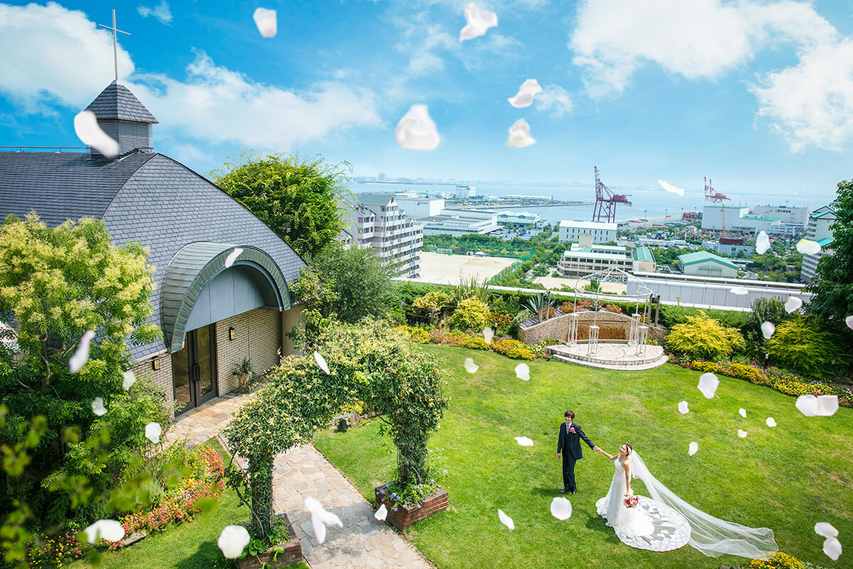 六甲ライナー「アイランドセンター駅」直結、六甲アイランド内にある「ホテルプラザ神戸」。ホテルならではのホスピタリティやサポート体制があり、地上60mのガーデンでは、自由度の高い演出が可能です。ホテルとゲストハウスの両方の魅力を兼ね備えるウエディングが叶います。都会の喧騒から離れた天空のガーデンから繋がるのは、ホテルでは珍しい独立型のチャペル。木のぬくもりに包まれ、大きな窓から自然光が降り注ぐチャペルは、ゲストとの距離も近く、一人一人の表情もしっかりご覧いただけます。挙式後のパーティは、ホテル最上階で雰囲気を変えて。会場内の窓から自然光が差し込み、開放的な雰囲気ですが、サンセットや夜景の中では幻想的な雰囲気にも。おふたりの好みでお選びいただけます。神戸ベイサイドならではの眺めも楽しみながら、アットホームで特別な時間をお過ごしください。