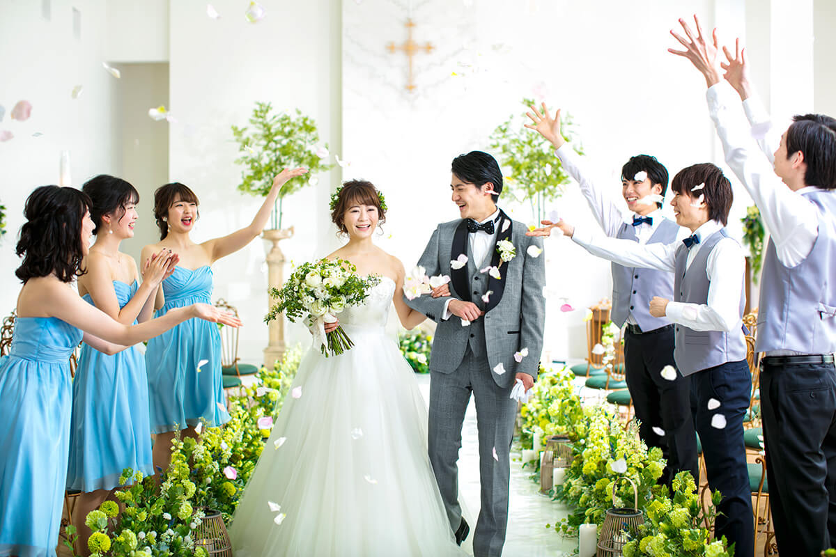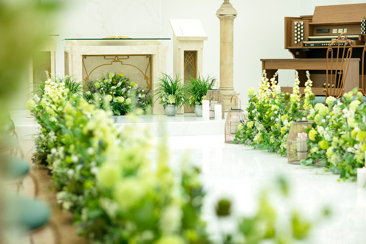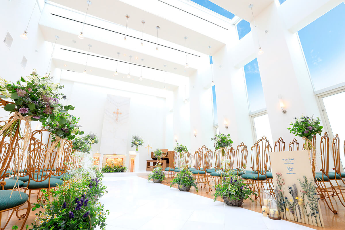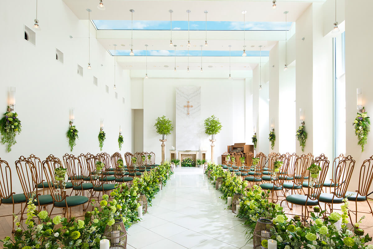 熊本市の中心街にありながら、静かで落ち着いた立地の老舗ホテル「ホテルメルパルク熊本」。挙式会場は天窓より自然光が降り注ぐ全天候型のチャペル「エンジェル」。白を基調とし、ナチュラルなグリーンで彩られた空間が陽光を受けて光り輝きます。ゲストとの距離も近く、あたたかくアットホームな雰囲気で、おふたりも絆を感じることができます。