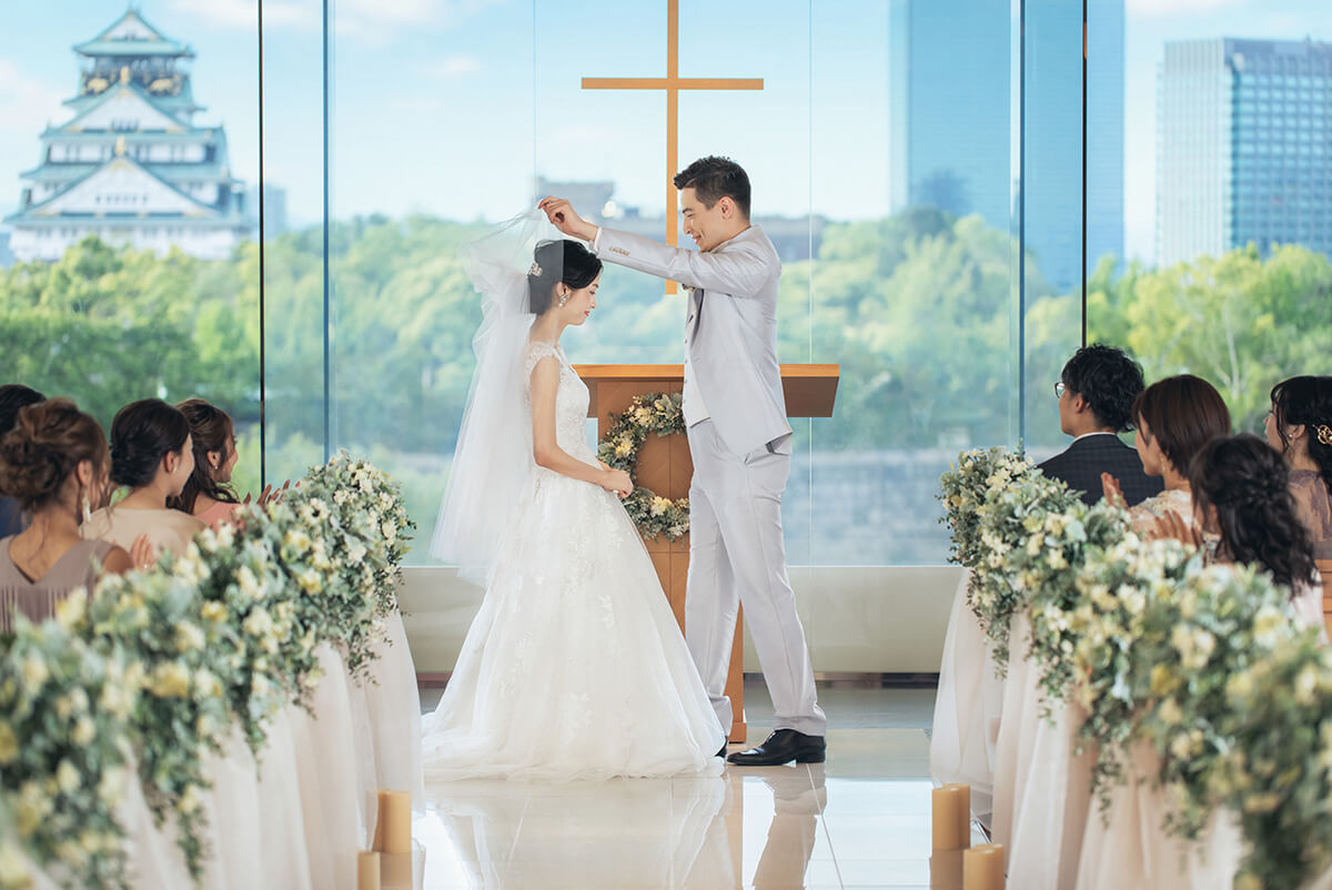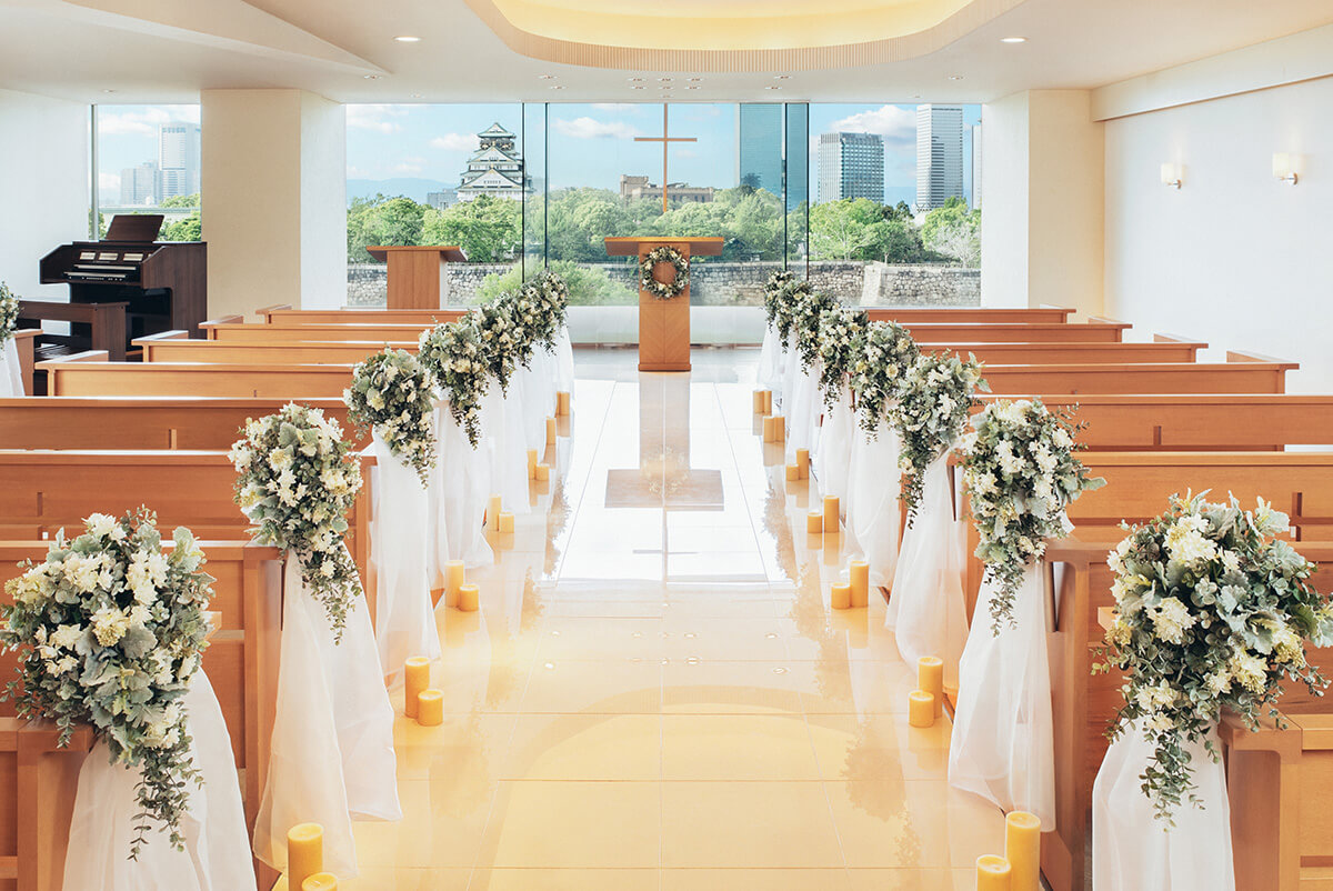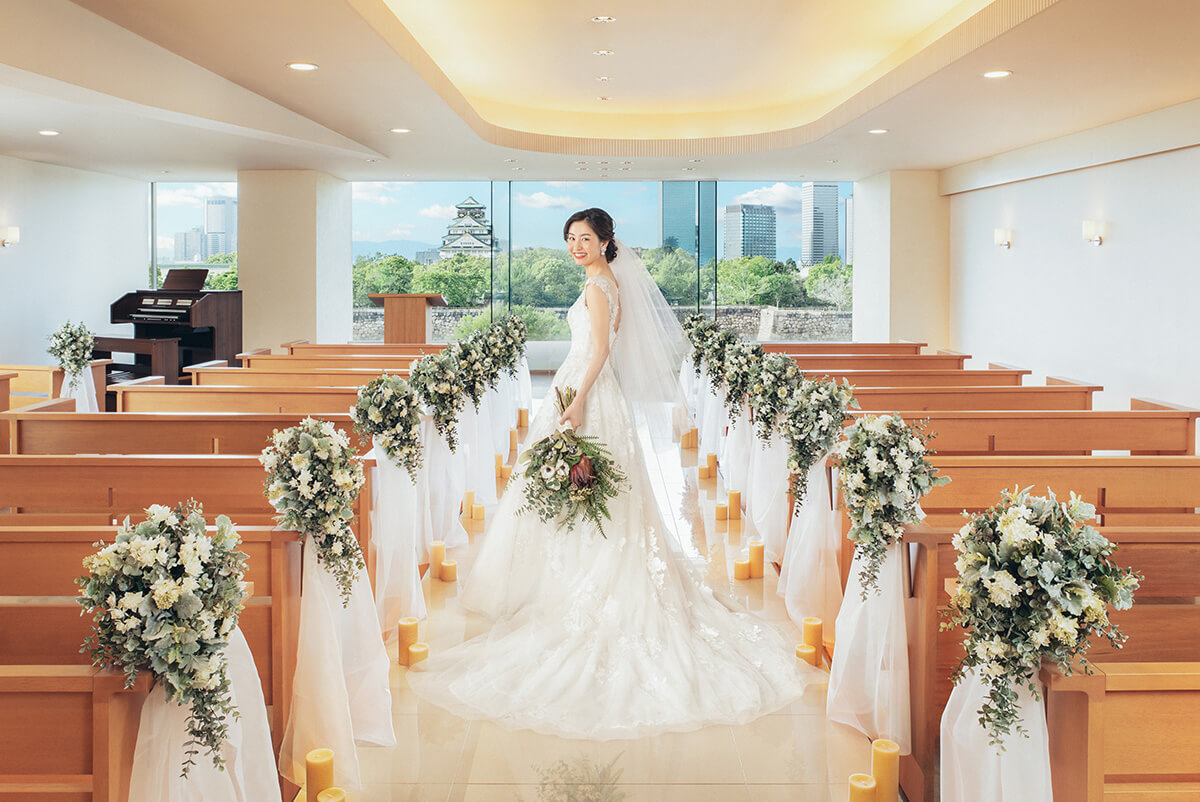 大阪城を一望できる解放感あふれるチャペルで叶える少人数ウェディング。ガーデン挙式かチャペル式かお好みで選べます。チャペルからは大阪城が見え、食事会場からも開放感溢れる景色が広がります。特別な瞬間を、大阪城の美しい景色と共にお楽しみください。