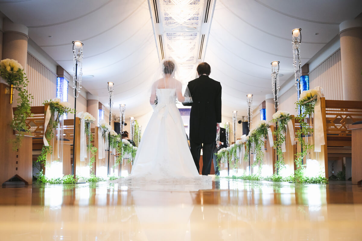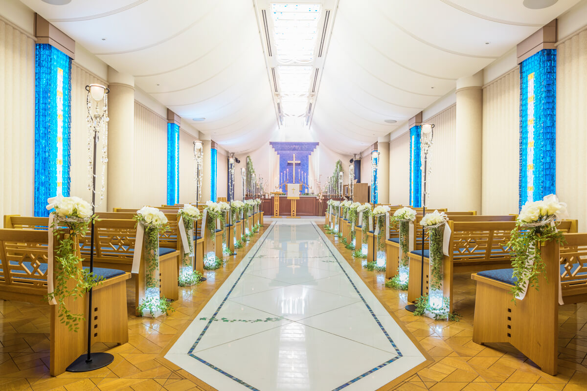 天井高く広がる荘厳なアーチと洗練されたシャンデリア、真っ直ぐに伸びる、白い大理石のバージンロード。チャペル内は自然光が差し込み、幻想的なブルーの光がおふたりを優しく包み込みます。ご家族やご友人に見守られながら、おふたりらしい誓いを紡ぐ。ホテルならではの上質空間で祝福と喜びに満ちたセレモニーが叶います。