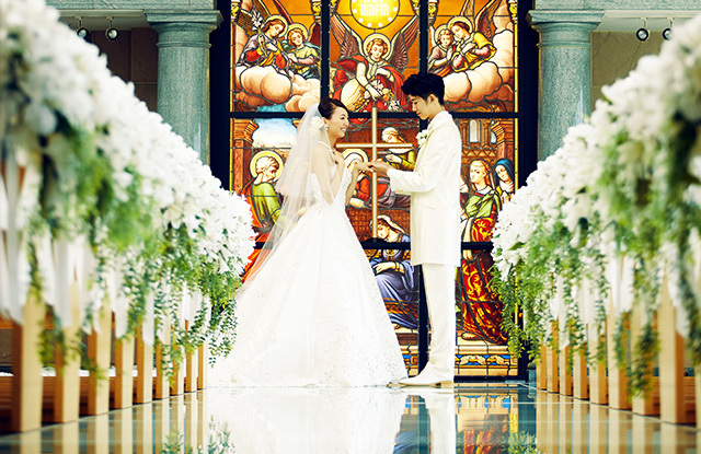 ホスピタリティが評価され、2015年に口コミサイト・トリップアドバイザーで殿堂入りを果たしたラグジュアリーホテル。ベイフロントながら、海浜幕張から徒歩4分と近いのも嬉しい。ヨーロッパで実際に使われていたアンティークのステンドグラスが自慢のチャペルで、優雅な結婚式をお楽しみください。