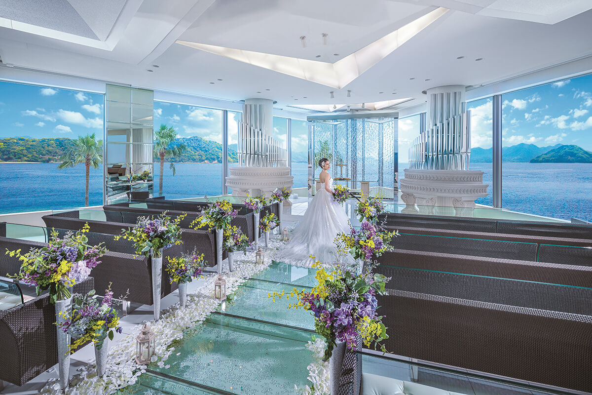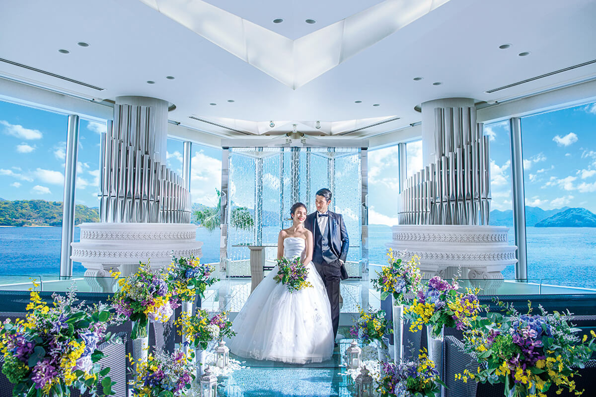 広島駅から車で約20分に位置する「グランドプリンスホテル広島」。多彩なウエディングシーンから選べる会場全てがオーシャンビューで、「非日常」に包まれるリゾートアイランドのアーバンリゾートホテル。 眩しい陽光と海と空のブルーに輝く瀬戸内海をバックに愛を誓うクリスタルチャペル「ラ ルミエール ヌーベル」は、ゲストに広島ならではの絶景と感動を届けます。 広島で唯一のホテルプロデュースの貸切ゲストハウス「プリンス ウエディング スイート」では、ホテルクオリティのおもてなし・付帯設備と、ゲストハウスの自由度が融合した贅沢な空間。理想の花嫁姿と上質なおもてなしのどちらも両立したい花嫁さまに人気です。空と海に祝福される感動のウェディングをご体感ください。