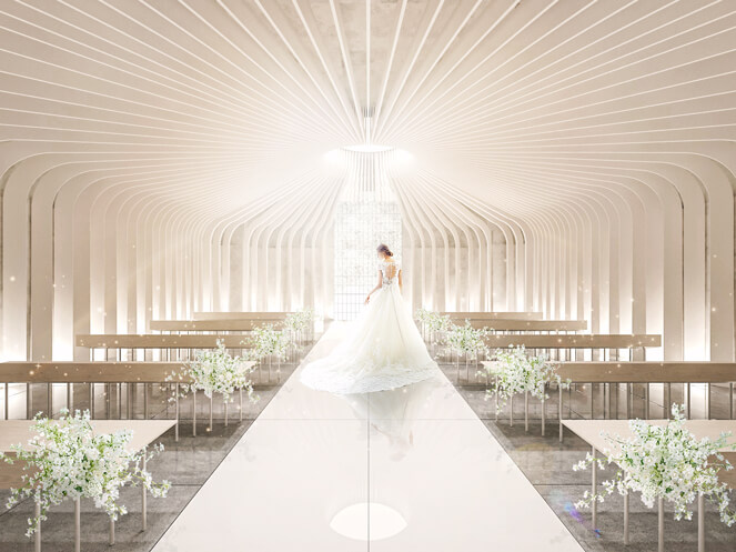 木目のルーバーが空間全体を優しく包み込む形状で、木の温もりを感じながら、家族や友人、ふたりを温かく迎えます。 天井から降り注ぐ光に導かれて歩み出し、ふたりを優しく照らします。 バージンロードの先ではクリスタルブロックが光り輝き、結婚式の幸せな瞬間を彩ります。 熊本市の中心に位置する熊本チャペルですが、都会の中での穏やかで贅沢なひとときを提供します。