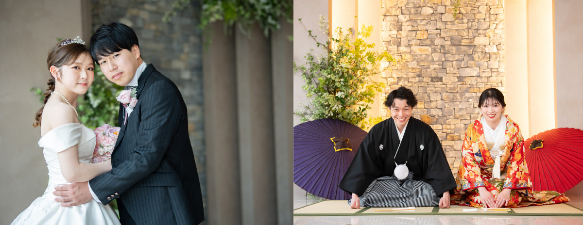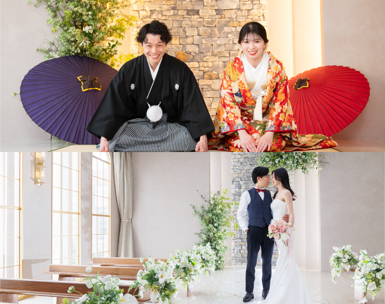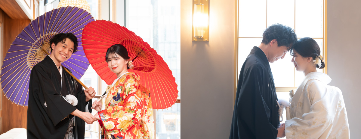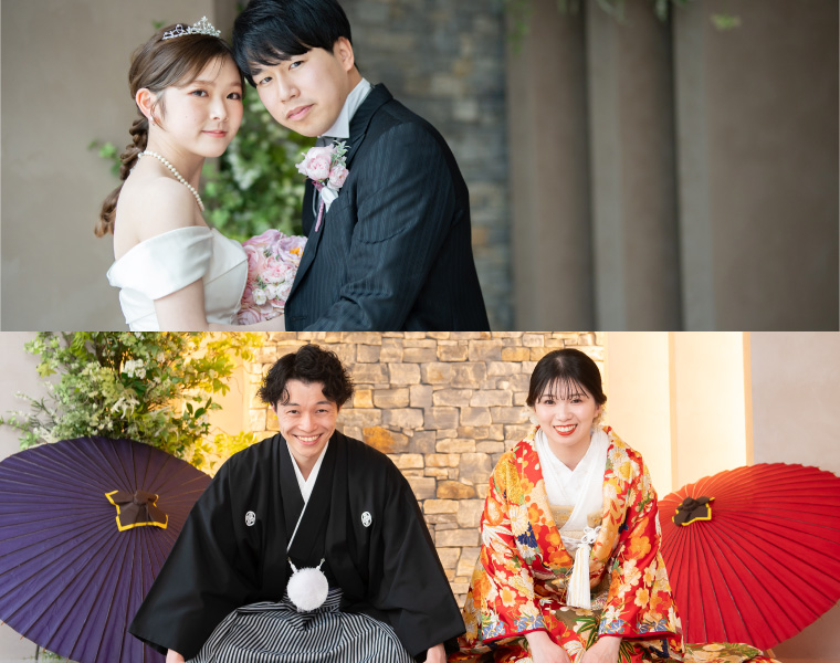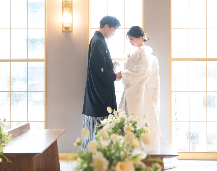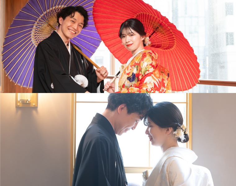 新郎・新婦様の白無垢などの衣裳はもちろん、和装にあうヘアメイクや小物もすべてついてこの価格です。